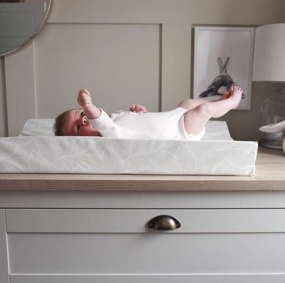 Bring a touch of boho to your baby changing table with the Bobbin and Bumble Wedge Changing Mat, covered in a stylish gold/beige leaves pattern that fits perfectly into a unisex or boho nursery theme.
