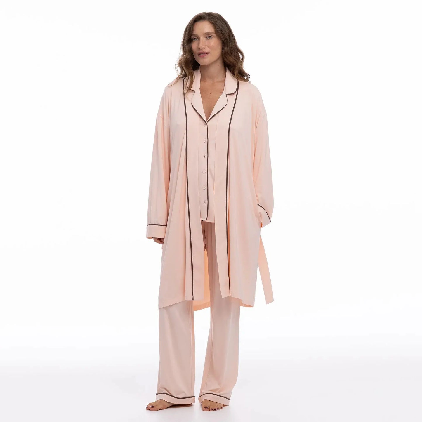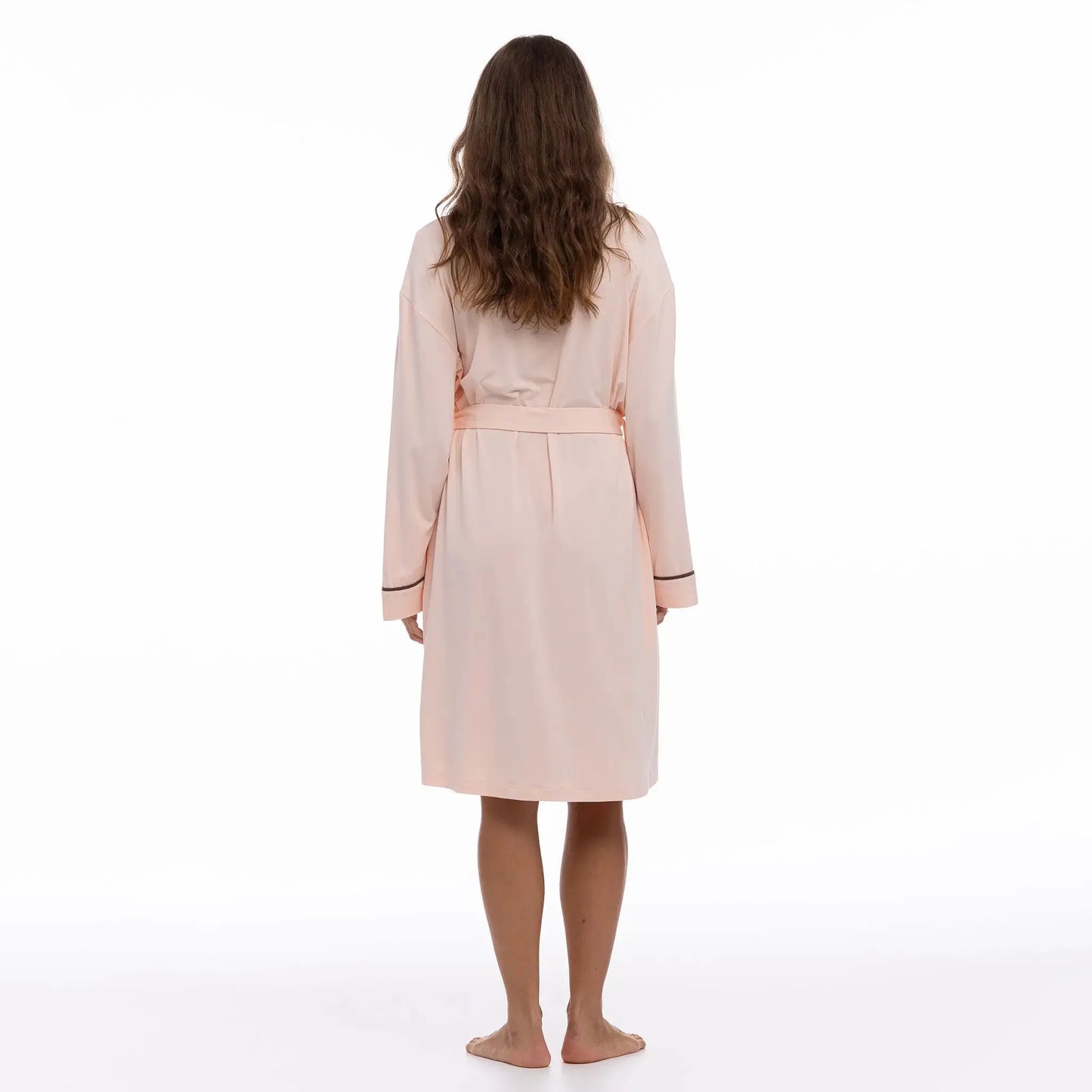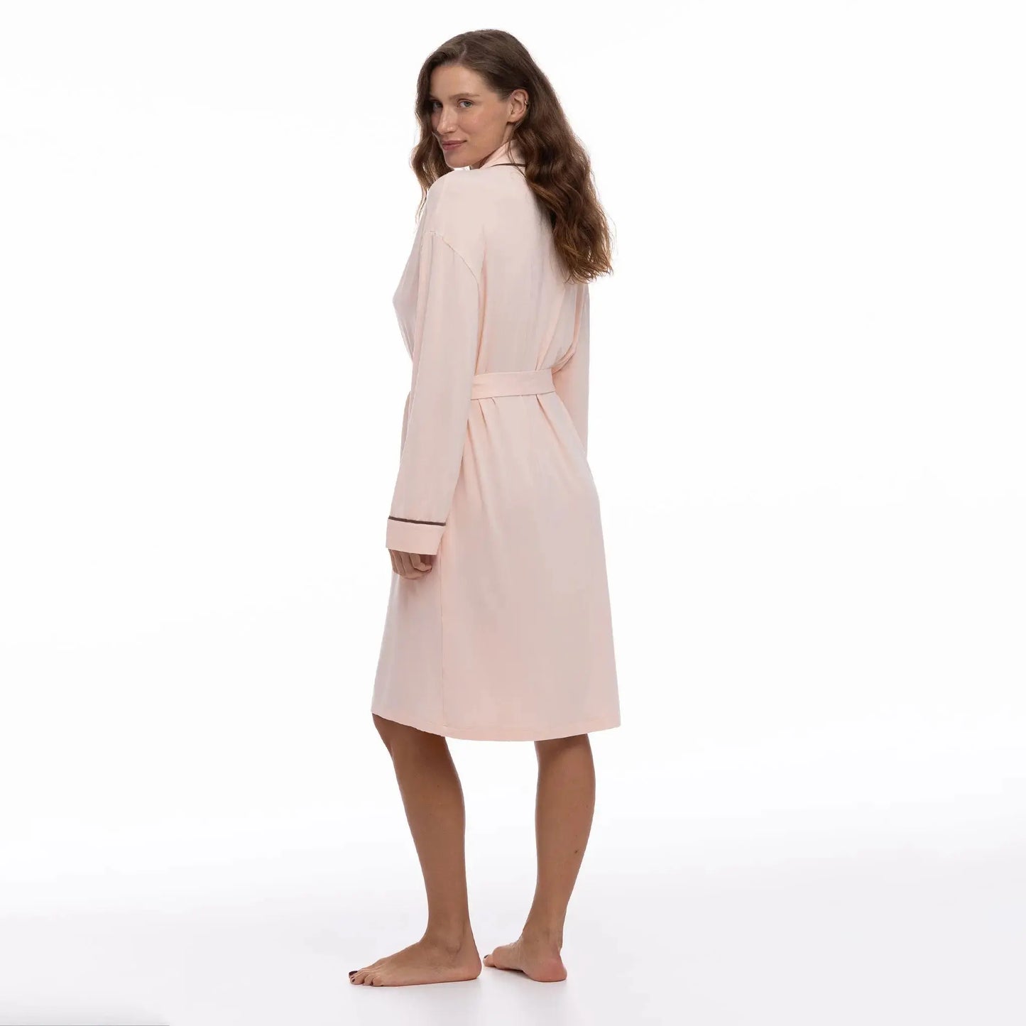 Available in Peach Powder with Ground Coffee trims, this robe brings gentle warmth and serenity to your loungewear. Its subtle tones make it ideal for elevating your at-home wardrobe.