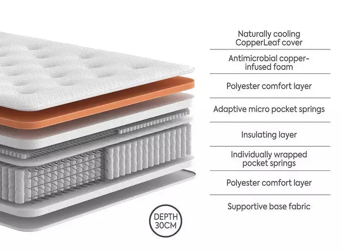 Featuring copper-infused foam and a CopperLeaf knitted cover, this mattress helps reduce heat build-up while offering natural antimicrobial protection. Copper works to eliminate bacteria, odours, and moisture—keeping your sleep surface fresher for longer.