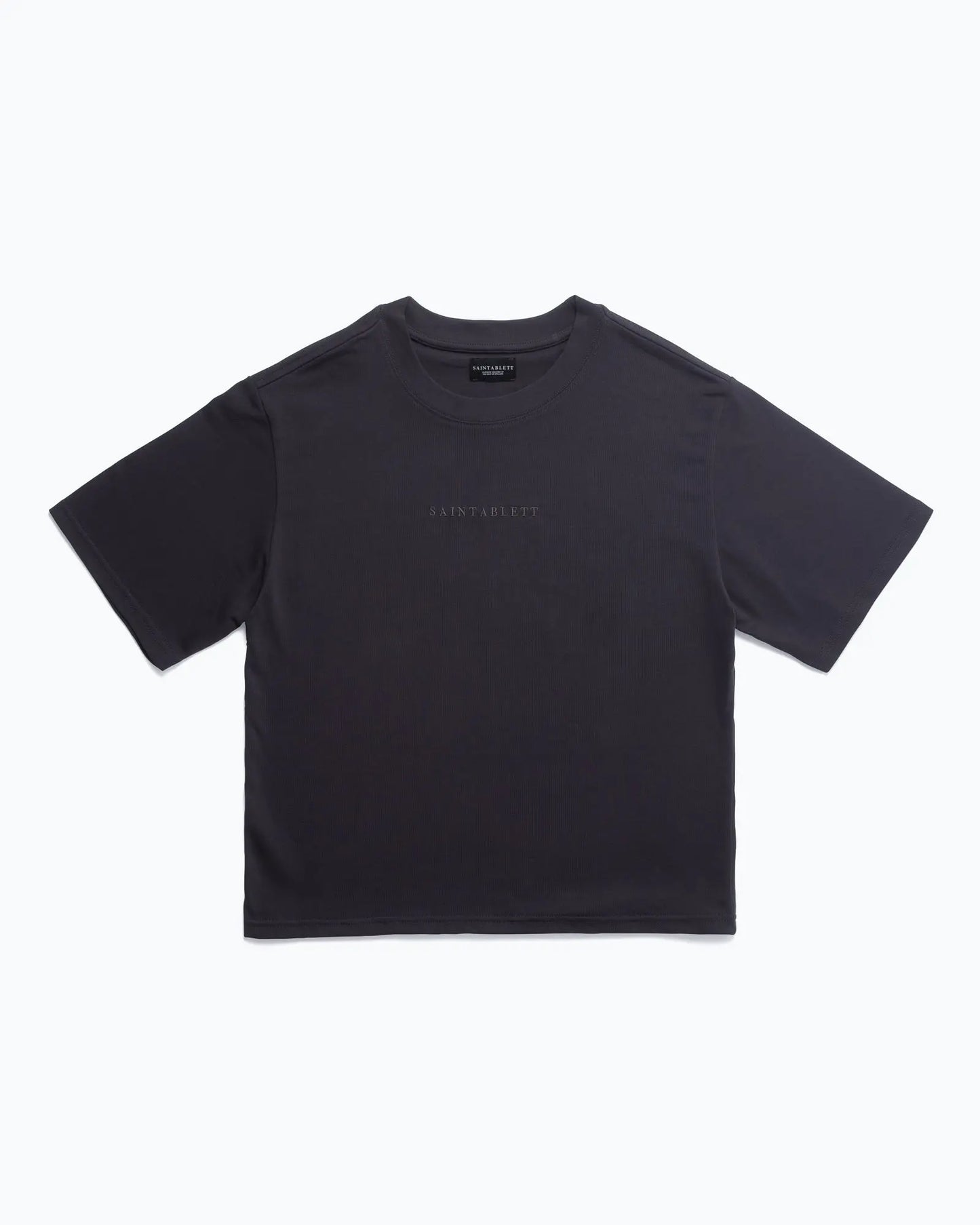 Tee 001 in Charcoal - Our signature silhouette. Crafted by hand in Leicester by our third generation family-owned factory to our exacting standards. 300gsm heavyweight jersey knitted from 100% cotton, with a dense, structured feel. Featuring SAINTABLETT logo embroidered to the centre with tonal thread, providing subtle, yet premium branding. Perfectly cropped for the ideal boxy fit, with woven SAINTABLETT labelling to the inner collar. Custom knitted and dyed cloth for a unique colourway and finish. Pair with TROUSER 001 for a complete look.