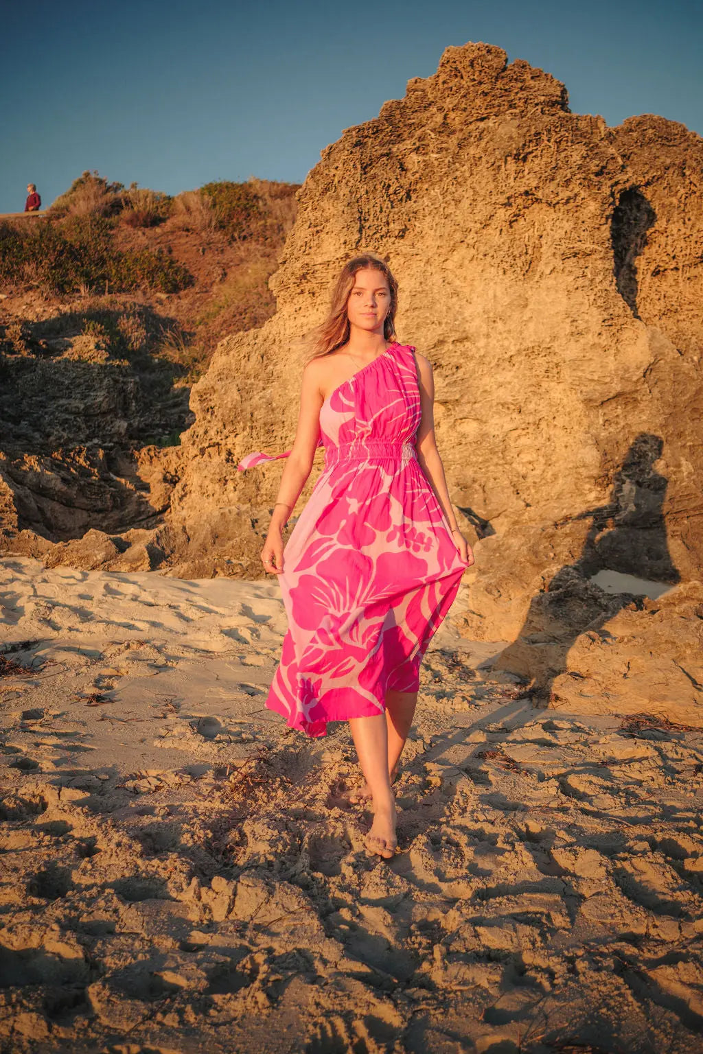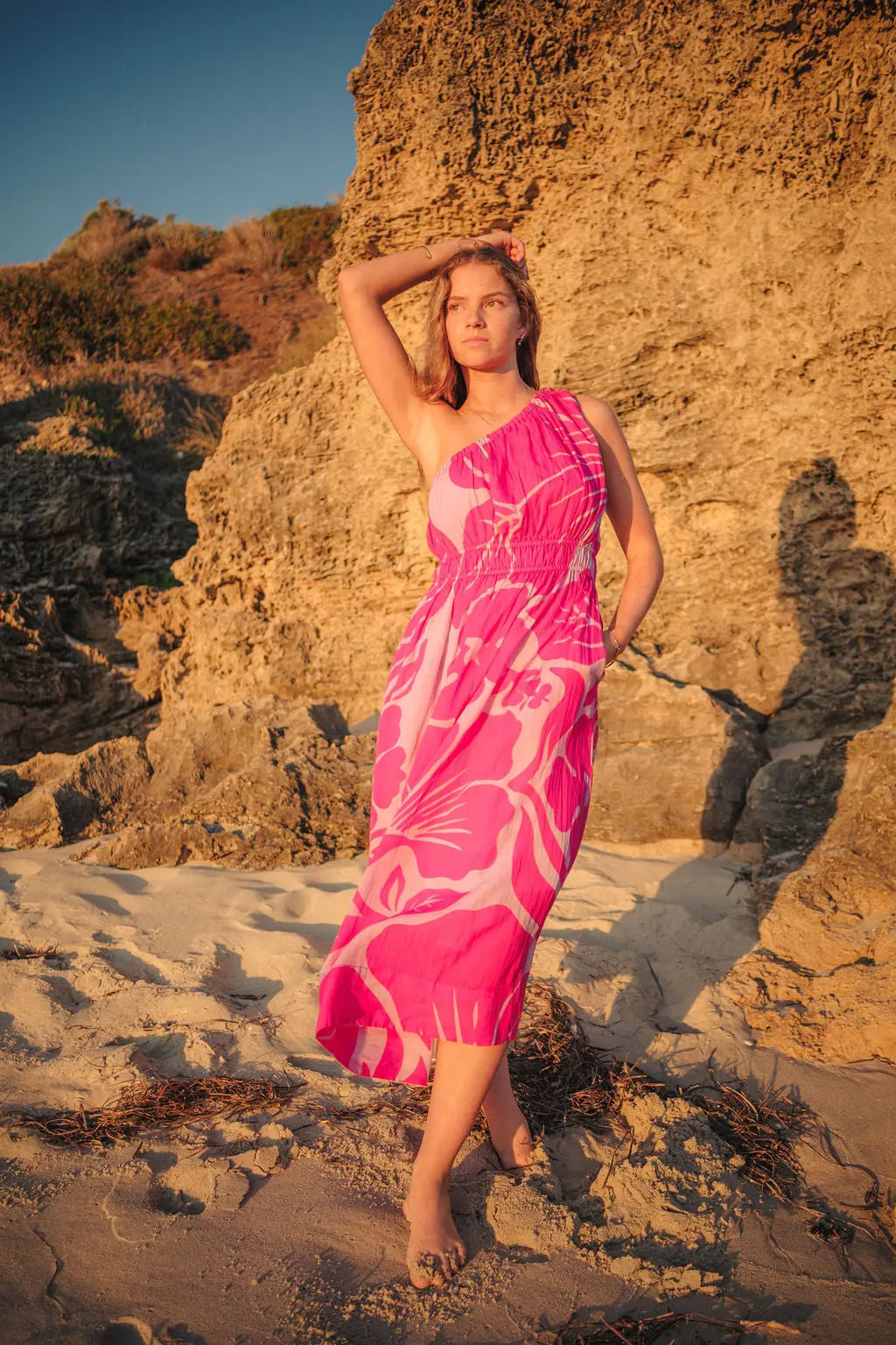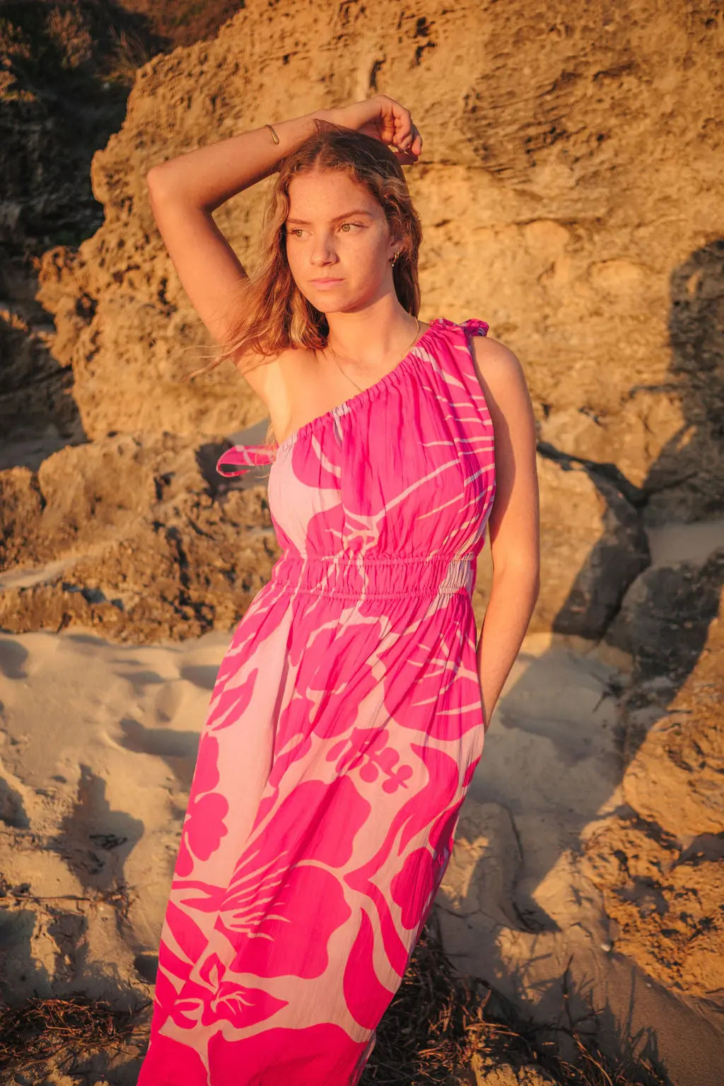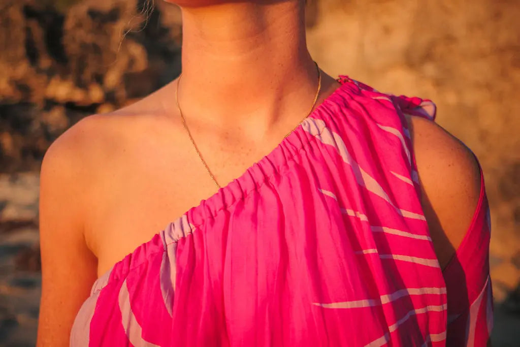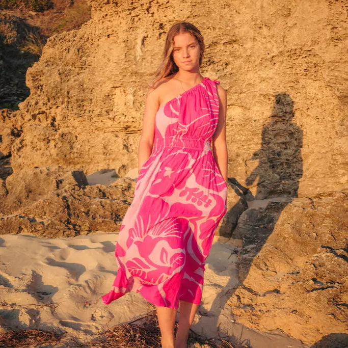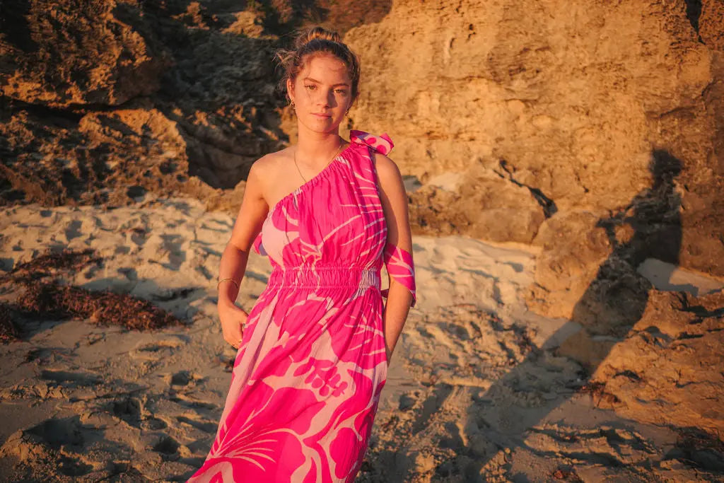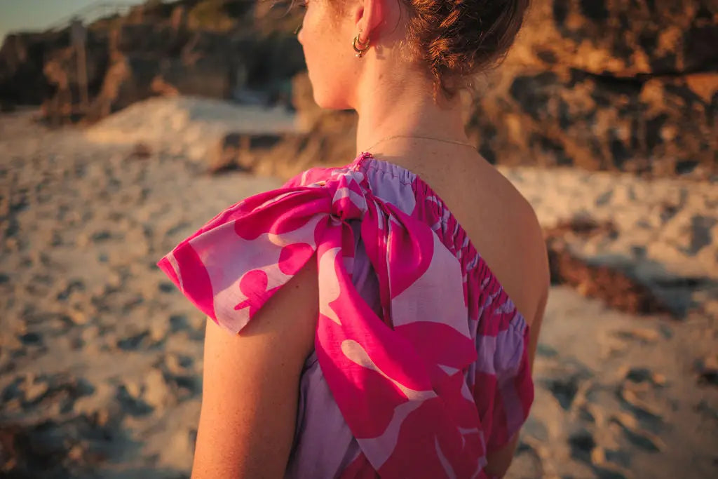 The peony-inspired floral print blooms across the fabric, bringing a vibrant, confident energy. And the one-shoulder silhouette? Sophisticated yet fun, ideal for turning heads at a summer wedding or feeling fabulous on holiday. But the real magic? That detachable bow. Wear it for a statement-making look, or take it off for a more laid-back, easy-going vibe.