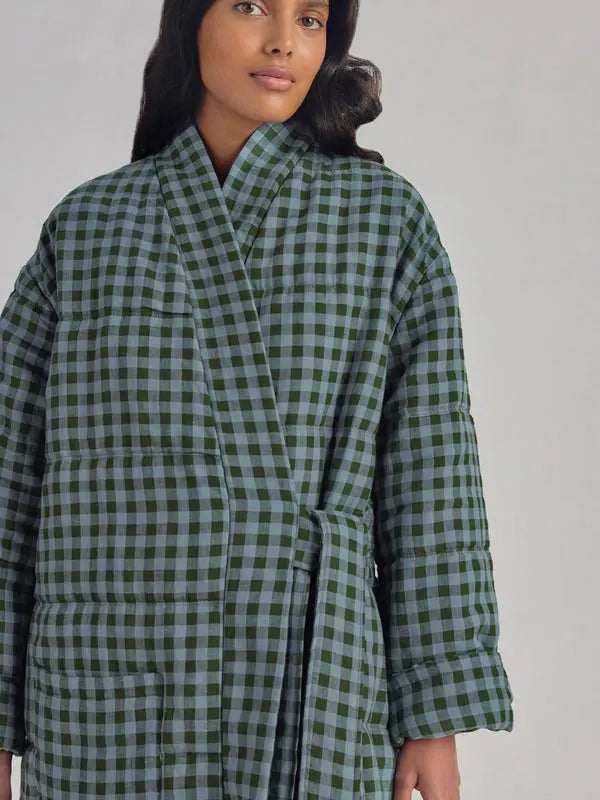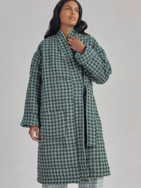 Wrap yourself in the uplifting tones of our Fern Green & Dusk Blue Colour Drenched Gingham linen blend housecoat. With its oversized silhouette, quilted finish, and practical pockets, it’s your perfect companion for slow mornings, relaxed evenings, and everything in between.