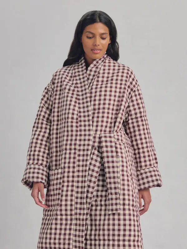 Wrap yourself in the vibrant charm of our Berry Gingham Linen Blend Housecoat. With its oversized silhouette, quilted construction and practical pockets, it’s the perfect layer for slow mornings, relaxed evenings, and everything in between.