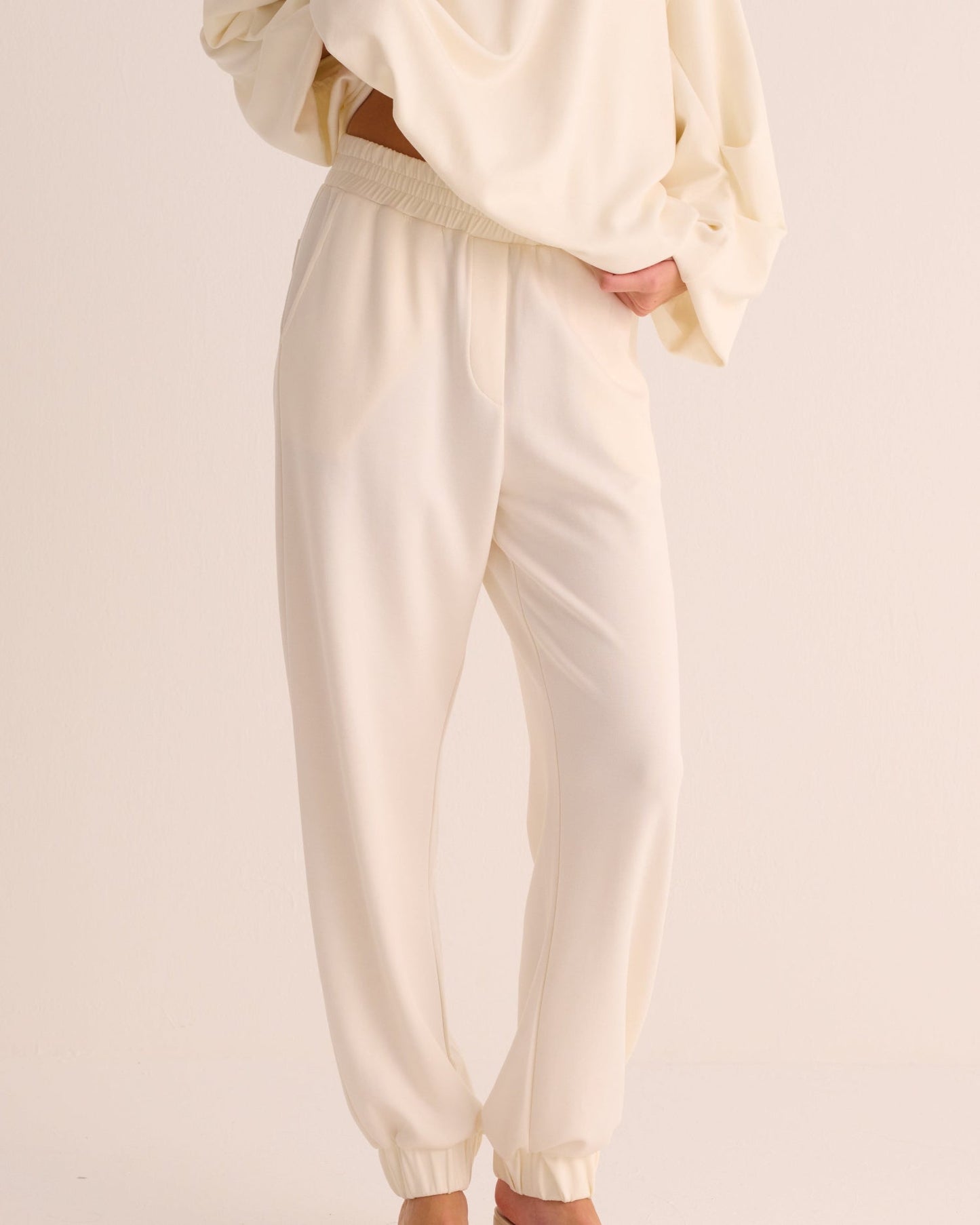 The joggers are designed to gently skim the body with a subtle taper, finished with a smooth waistband that sits comfortably without digging in. The result is an easy, polished fit for everyday wear.