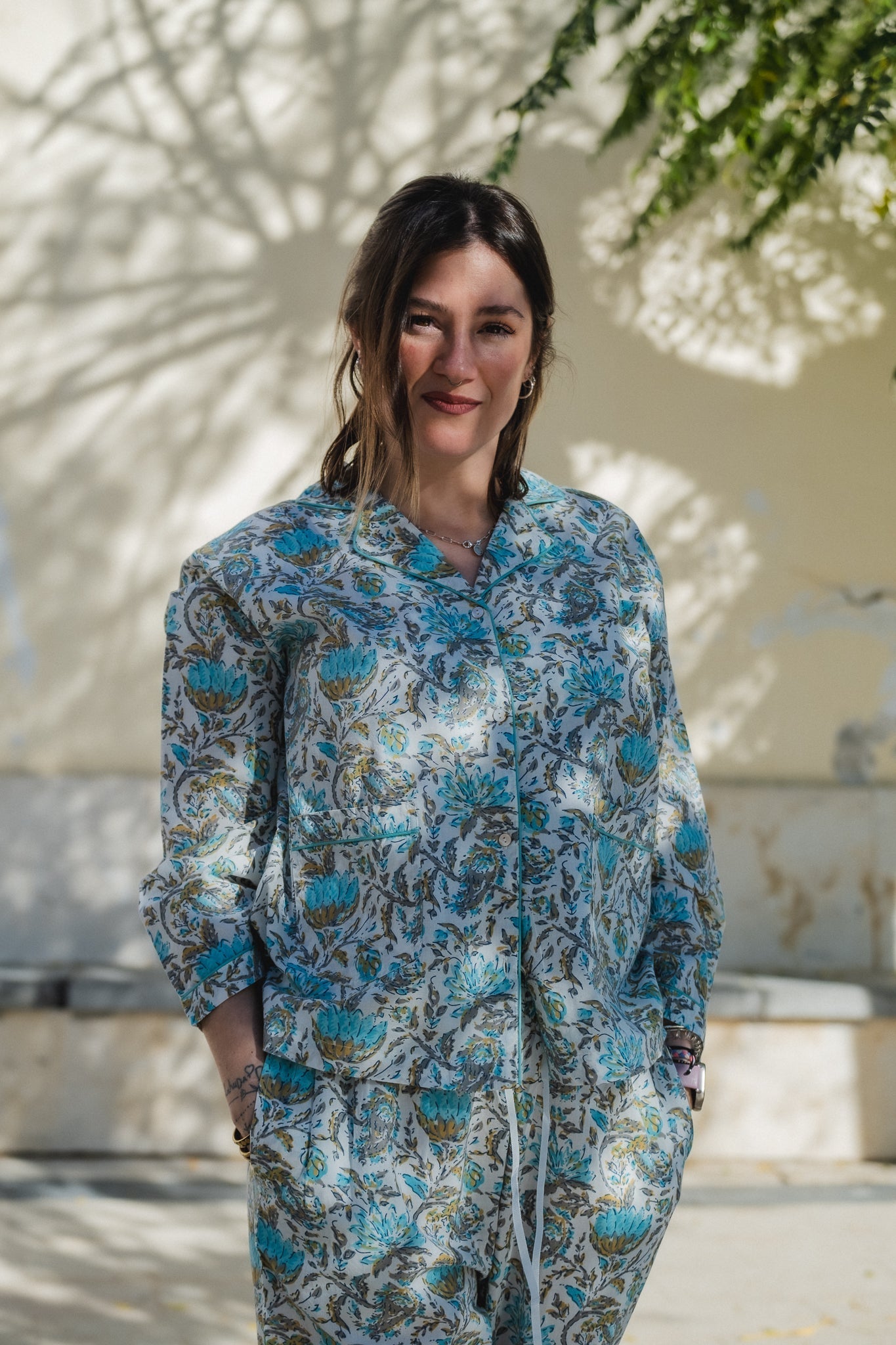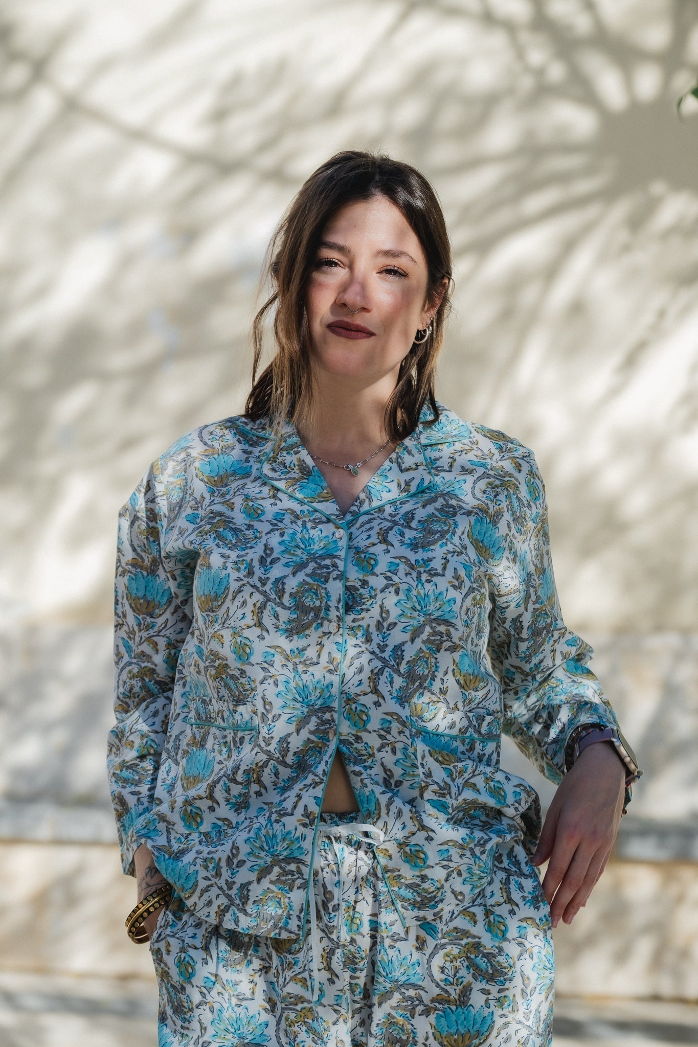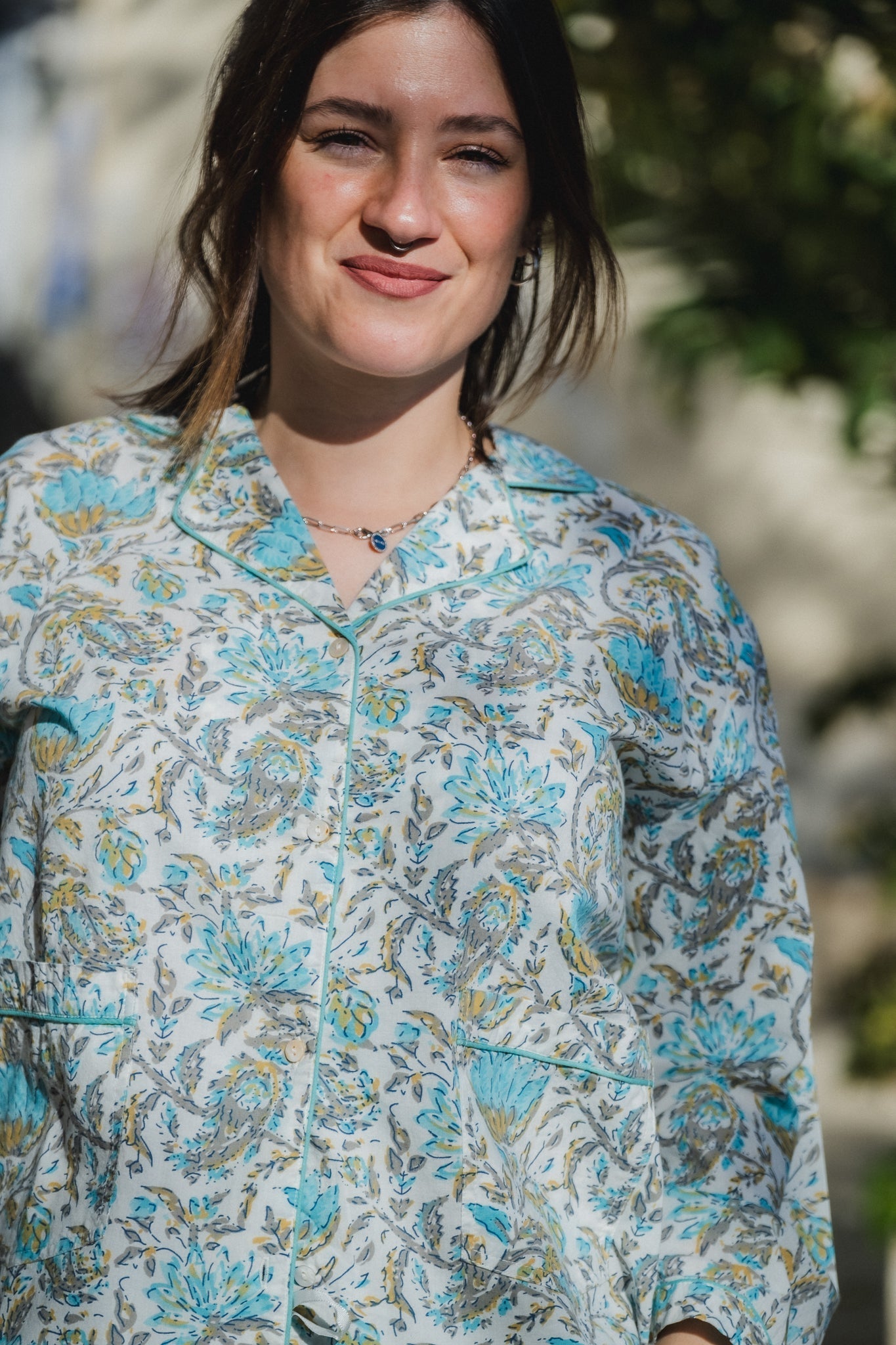 Brighten your nights with our Ahaana Turquoise Block Printed Cotton pyjamas! Crafted from 100% natural, breathable cotton, these pyjamas are perfect for a cosy and comfortable sleep. The boxy shirt design offers ultra comfort, while the beautiful drawstring adds a cute touch to your loungewear, making them ideal even for staying in. The lightweight, soft fabric ensures you stay cool and relaxed all night long. The vibrant turquoise block print adds a touch of fun and elegance. Embrace the luxury of natural cotton comfort!