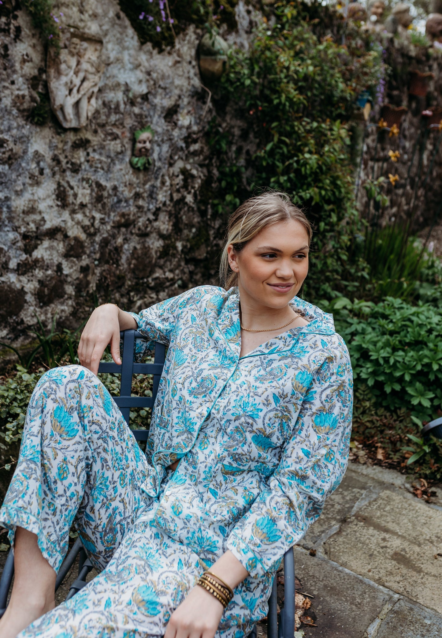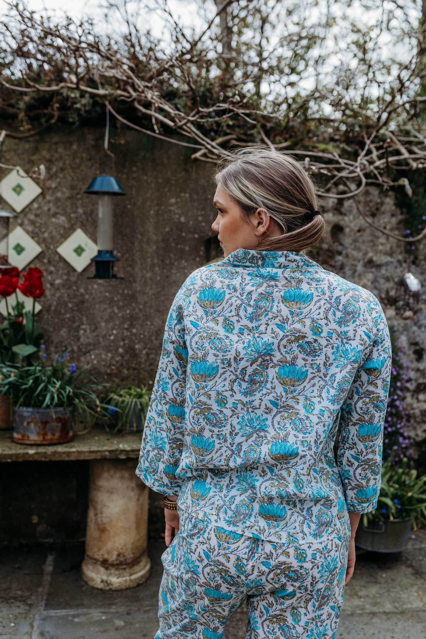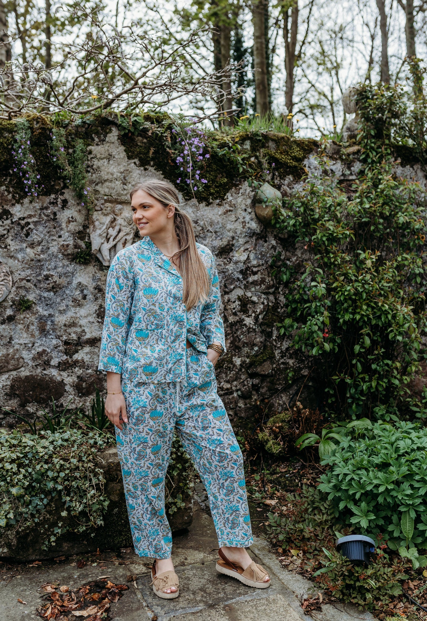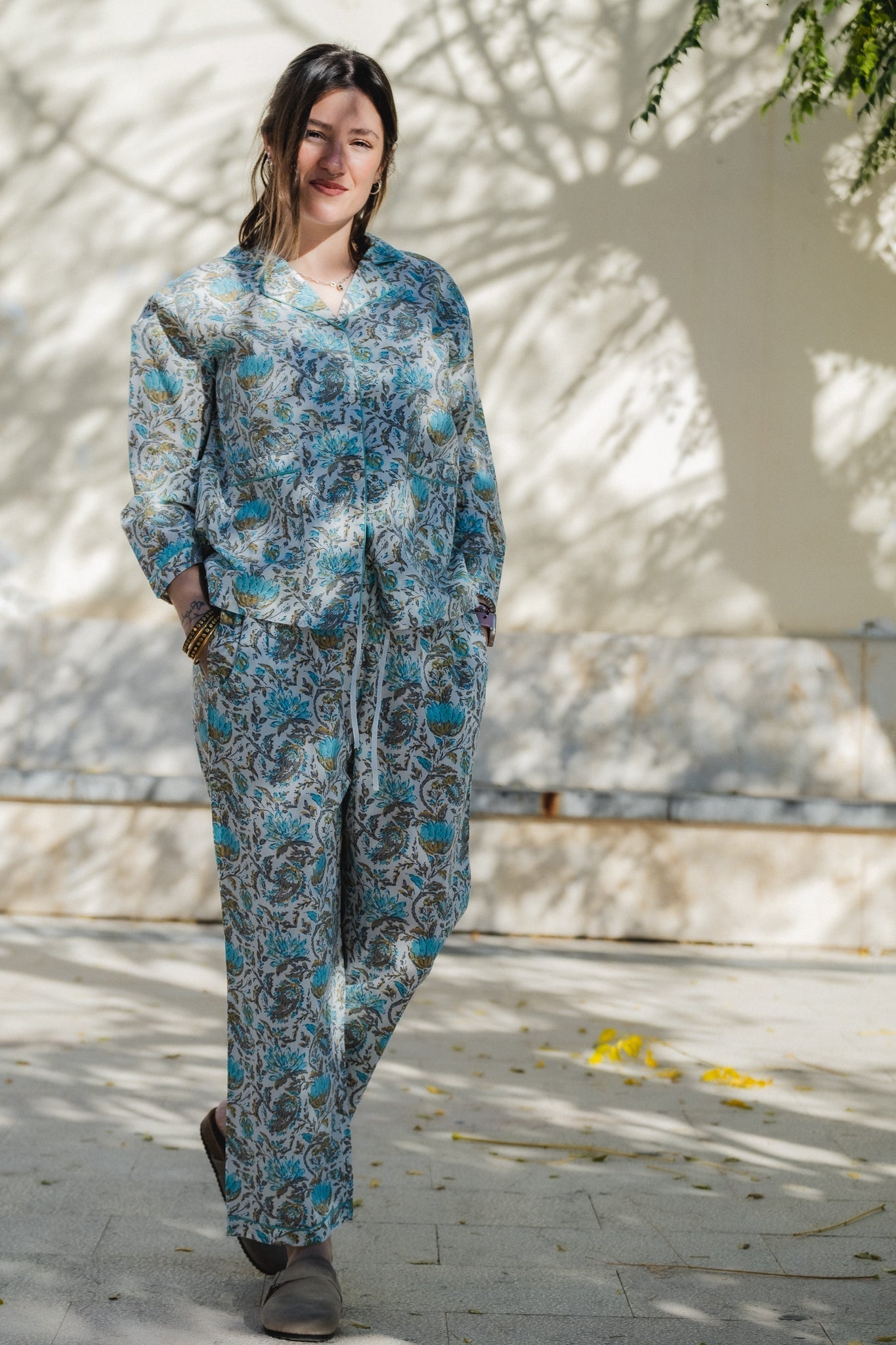 Ahaana Turquoise Block Printed Cotton Pyjamas