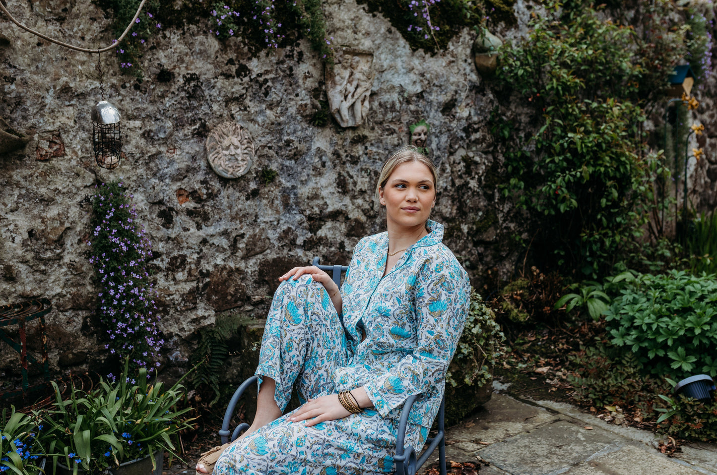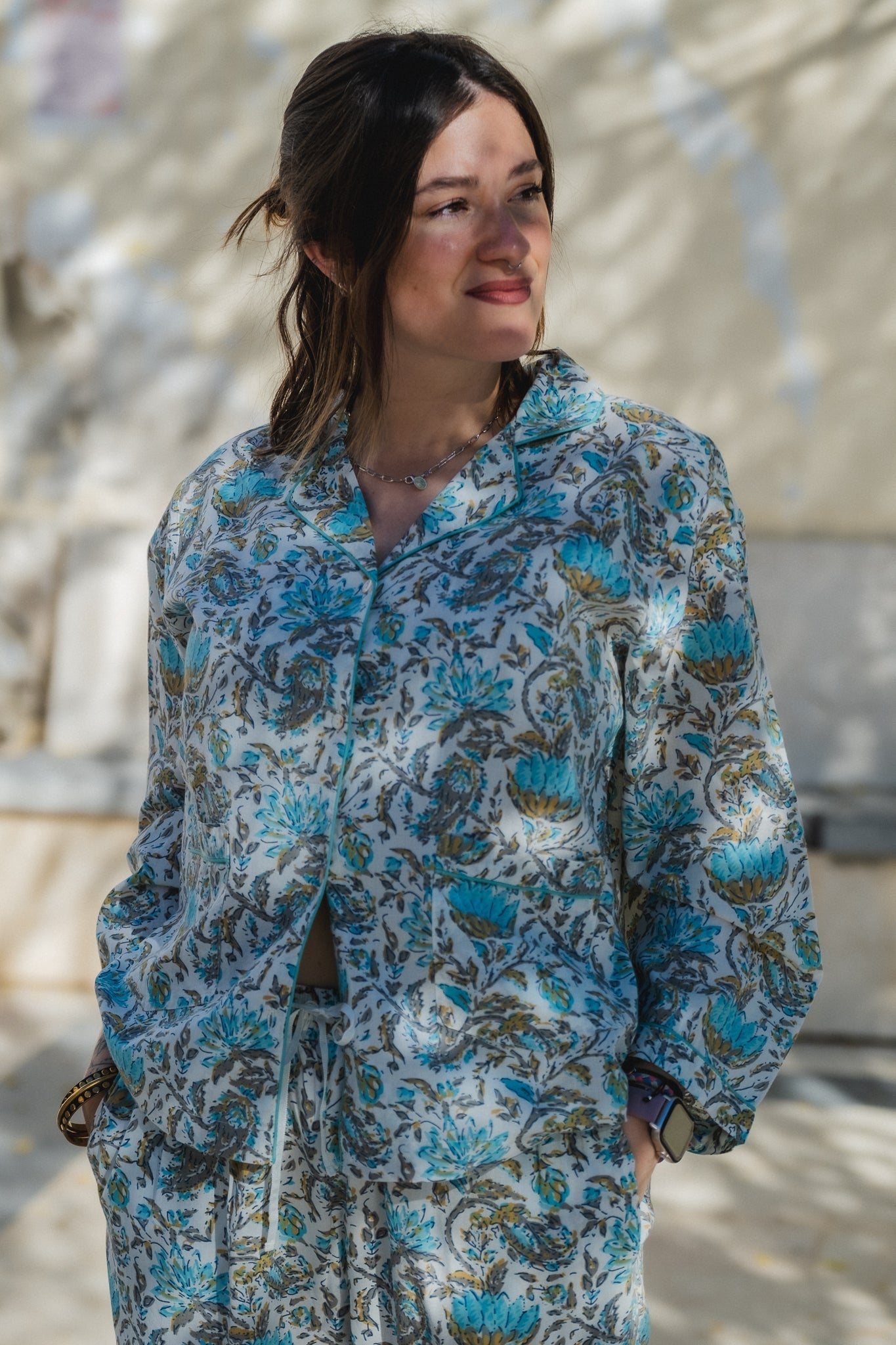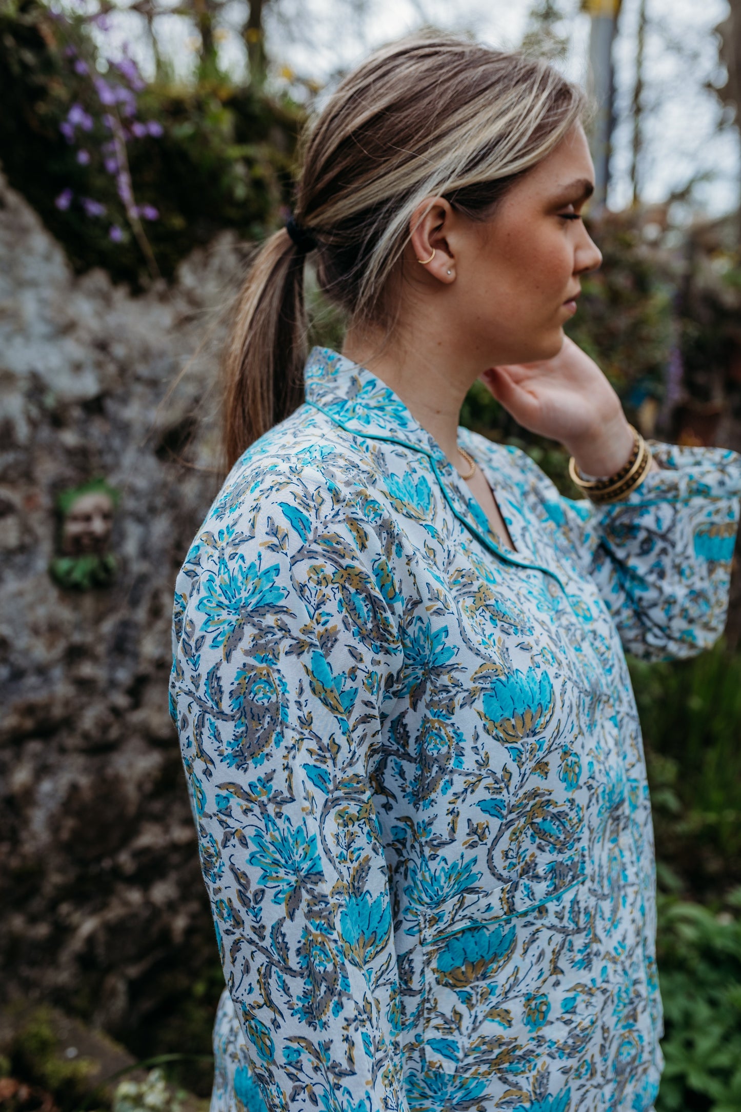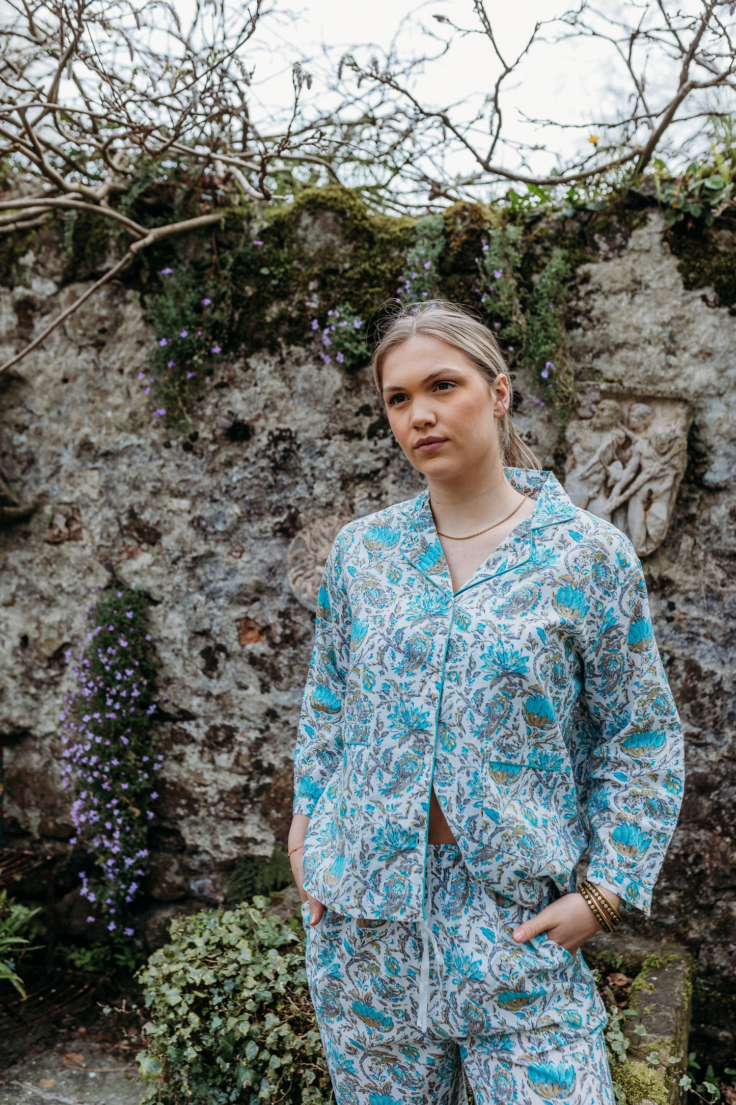 Ahaana Turquoise Block Printed Cotton Pyjamas