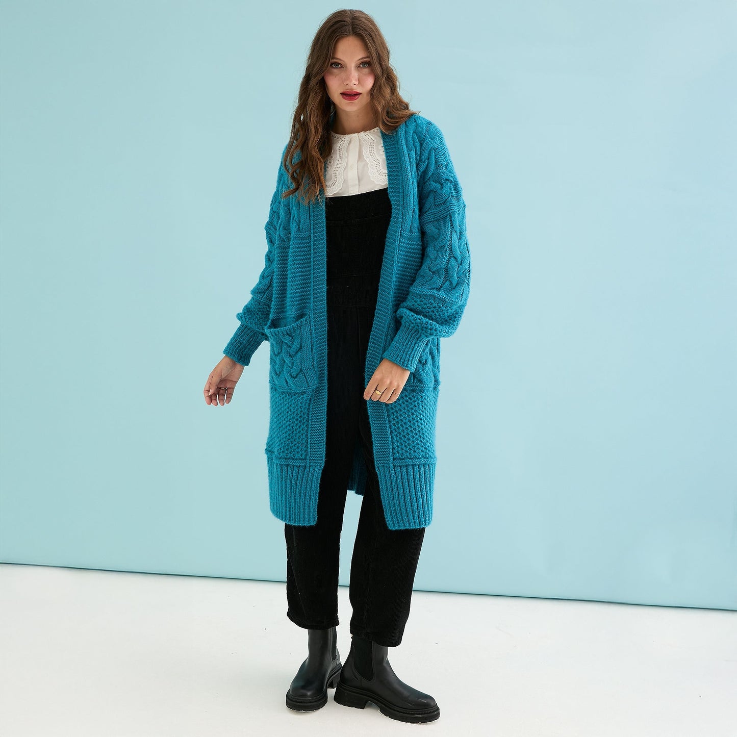 Say hello to Alex – your go-to oversized cardigan with a bold twist. Crafted in a rich teal hue and full of textural detail, Alex features chunky cables, deep patch pockets and an easy open front. The silhouette is very relaxed and slouchy, making it perfect for layering across seasons.