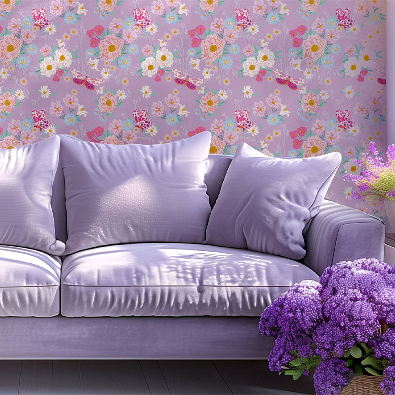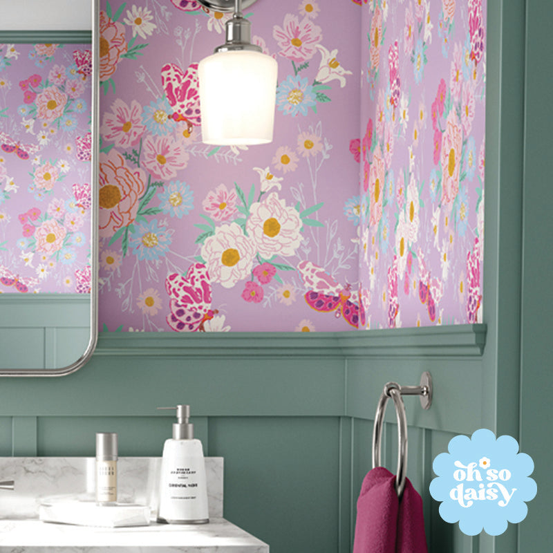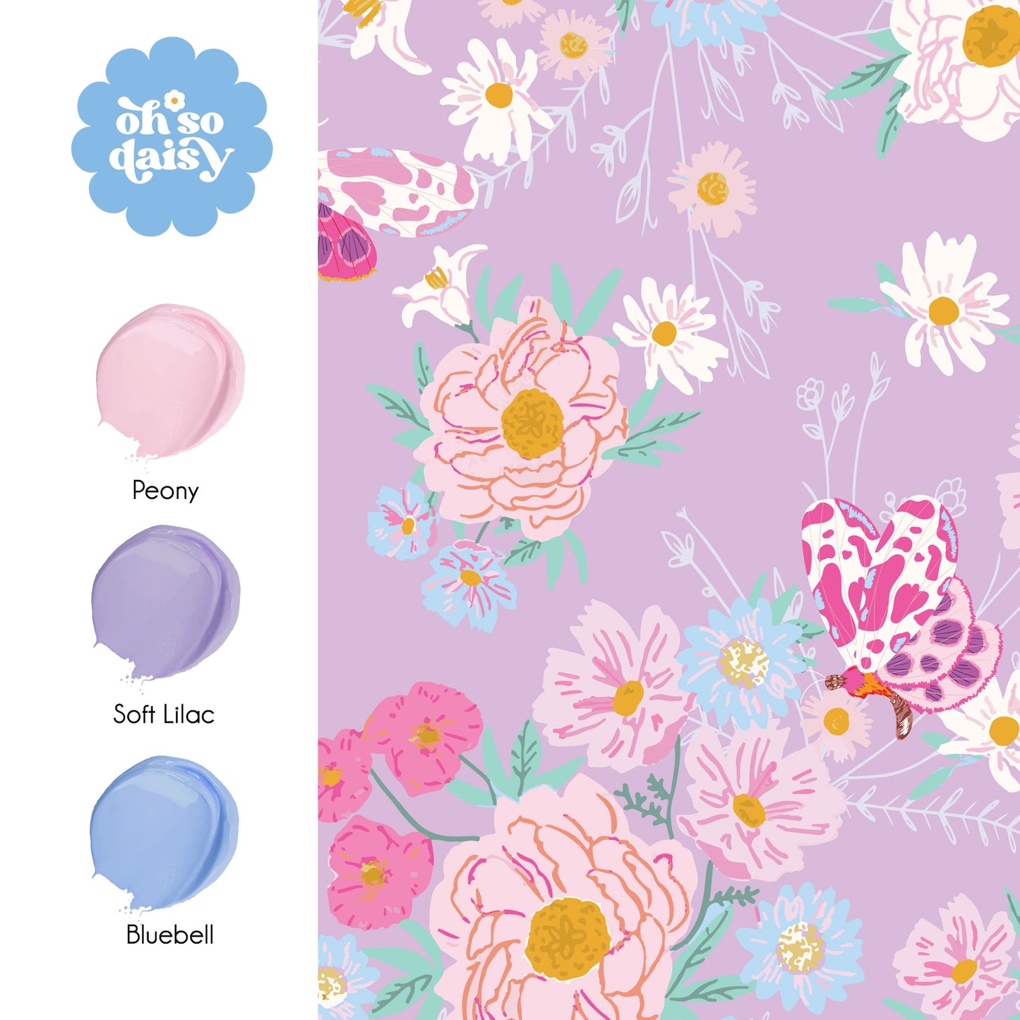 Our most delicate design! Dancing butterflies adorn painterly flowers on a dreamy lilac sky. This soft pastel pattern is suitable for so many rooms and adds a touch of whimsy and warmth to your interiors.