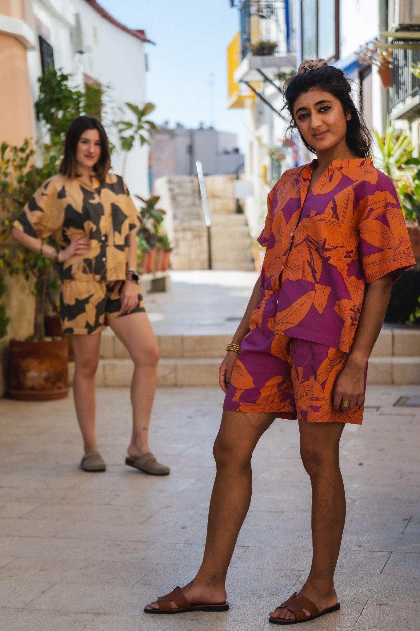 Introducing the ultimate bedtime essential - our bold flower print pyjama shorts in an eco-friendly pink and orange combo! Crafted with love and care, these PJs are not only incredibly stylish and comfortable but also kind to our planet.