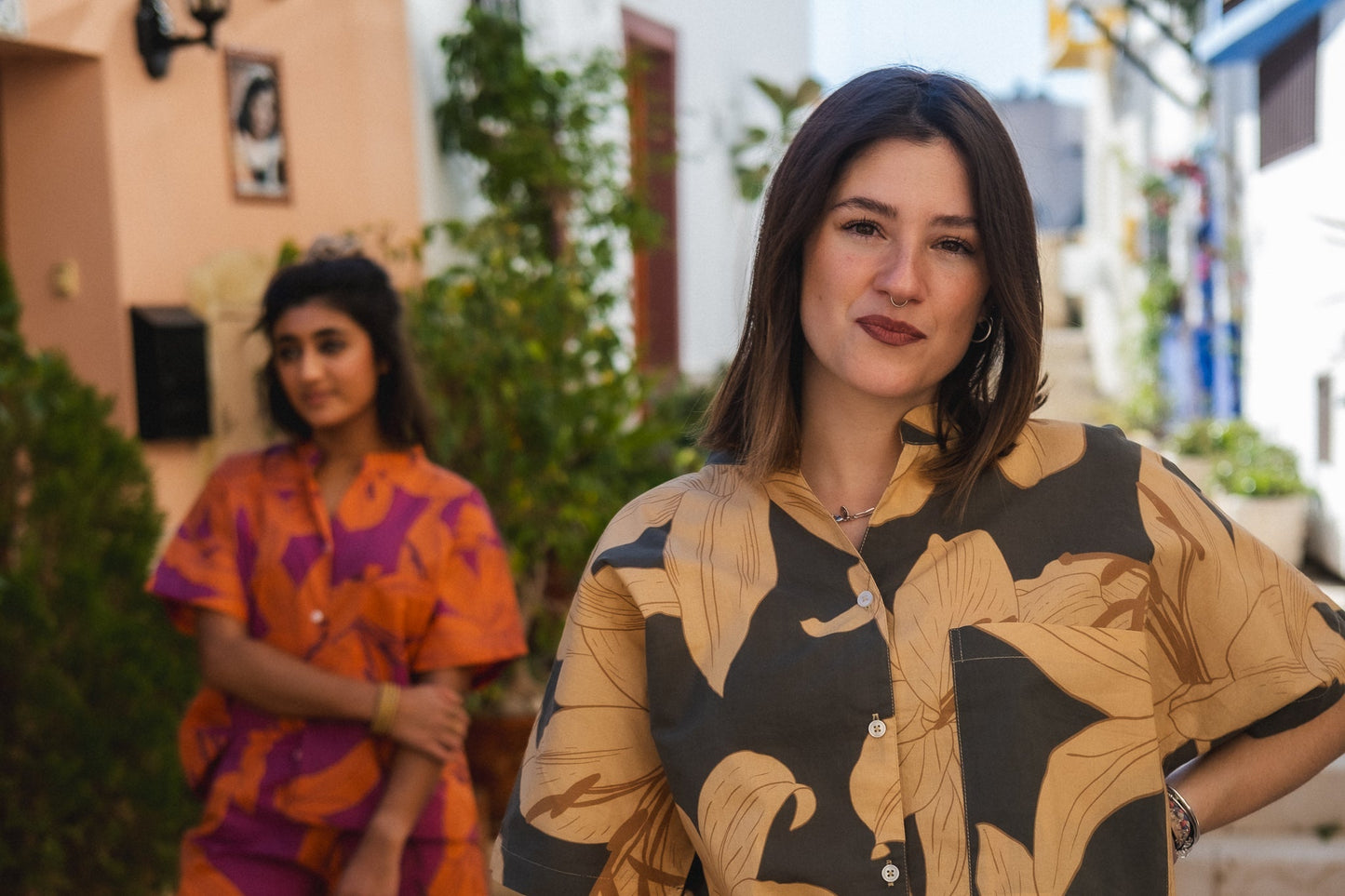 Introducing the ultimate bedtime essential - our bold flower print pyjama shorts in an eco-friendly olive and mustard combo! Crafted with love and care, these PJs are not only incredibly stylish and comfortable but also kind to our planet.