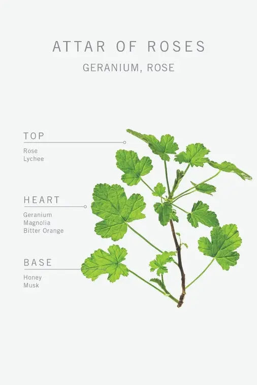 Inspired by the delicate Pelargonium Attar of Roses, this luxurious candle captures the scent of a summer garden in full bloom. Fresh floral top notes of rose and lychee open the fragrance, leading to a heart of geranium and magnolia, balanced by subtle hints of bitter orange leaves. A base of honey and musk provides a rich, warm finish that lingers with timeless elegance.