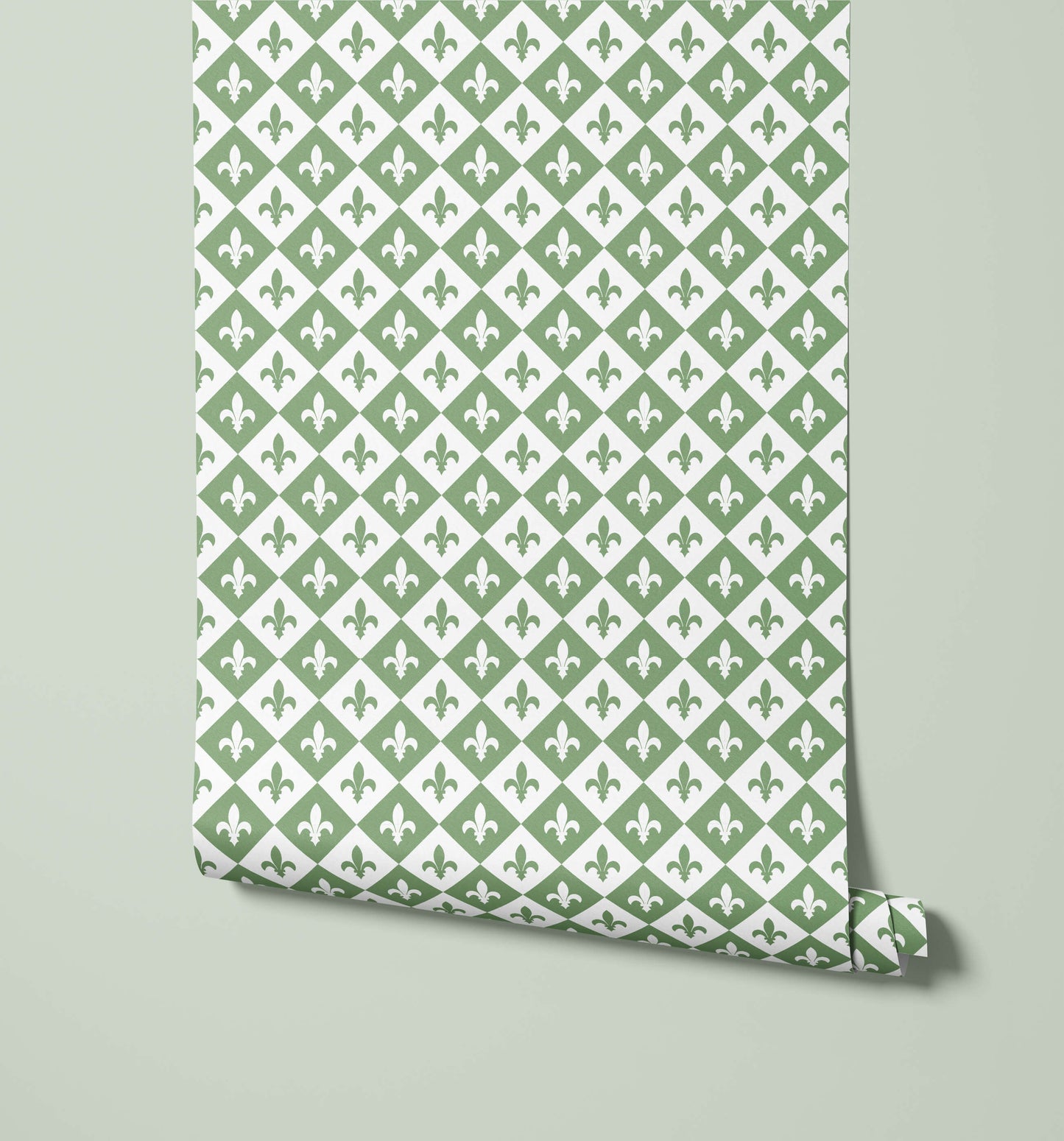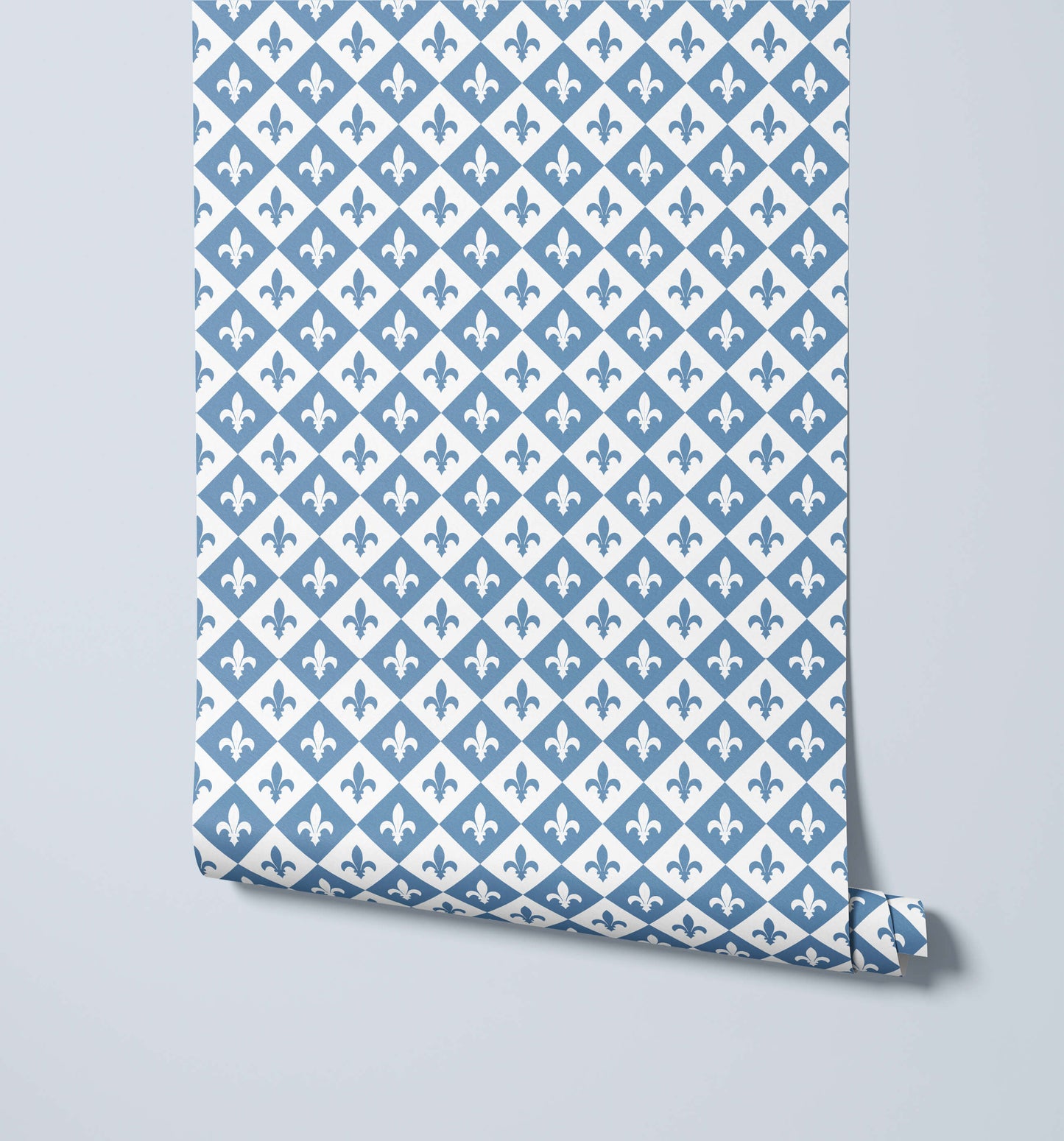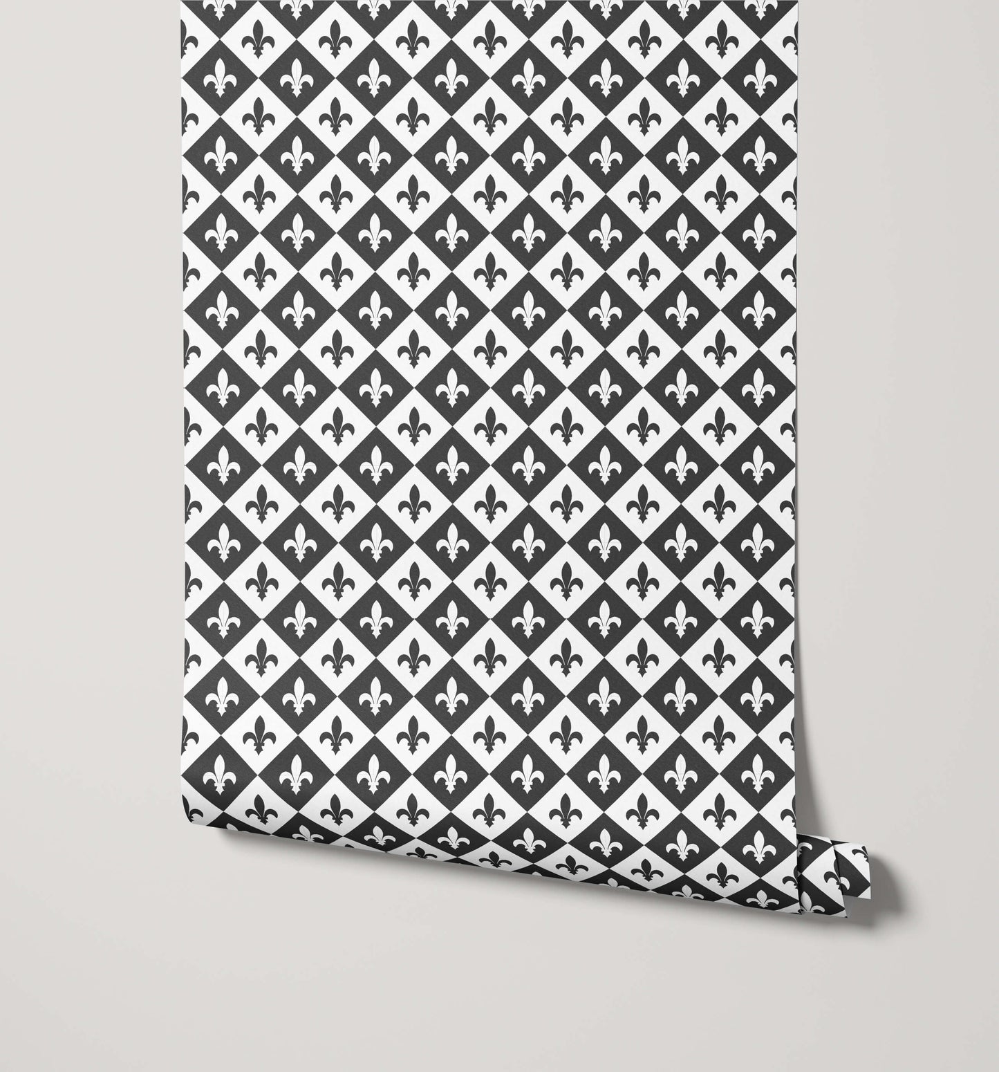 The Diamond Fleur De Lis Wallpaper presents a bold, high-impact pattern that perfectly blends classical heraldry with modern geometric structure. The design features the iconic Fleur-de-lis motif placed precisely within a striking diamond grid, creating an energetic yet highly ordered repetition across the entire surface. This alternating placement achieves a dynamic visual flow while maintaining a sophisticated, tailored look.