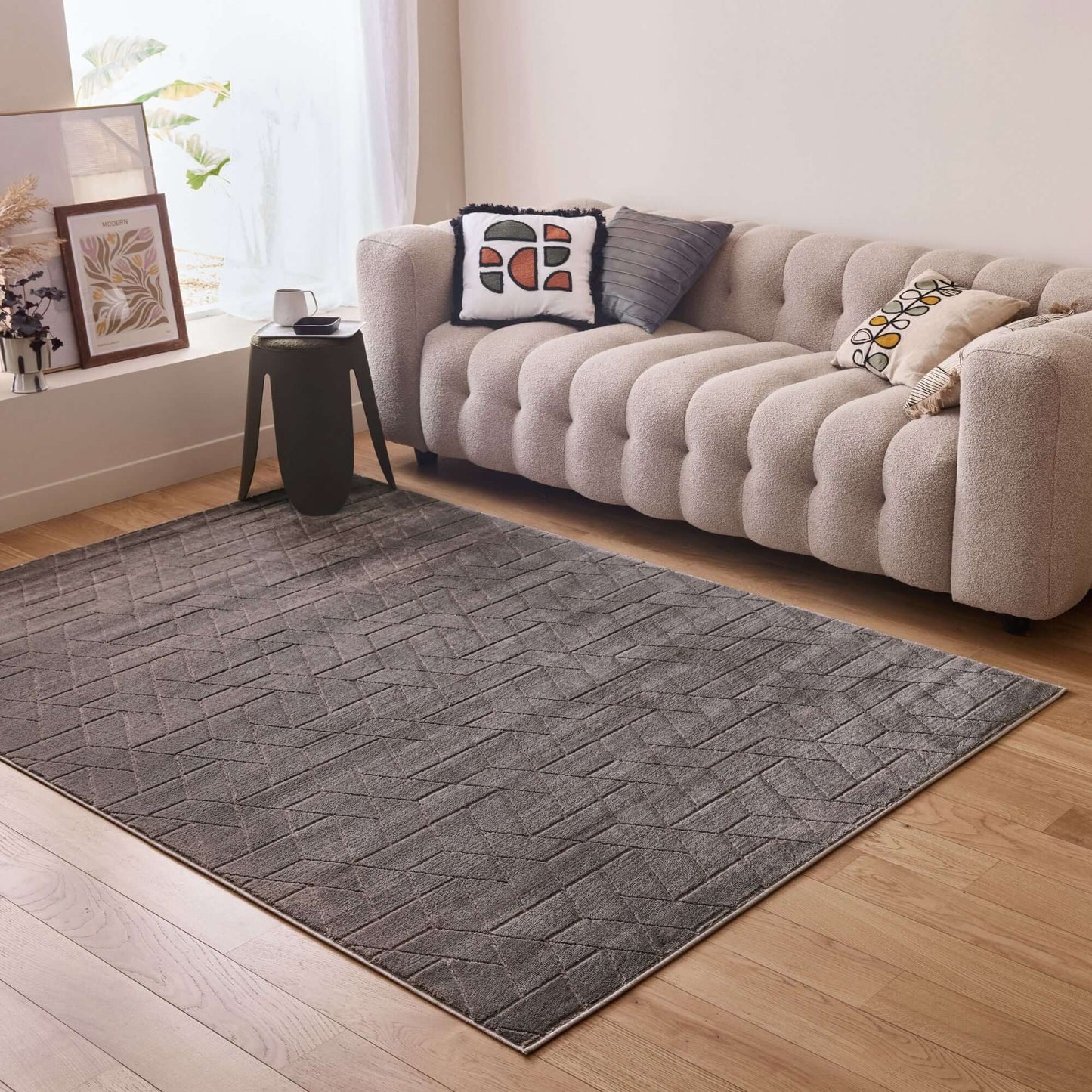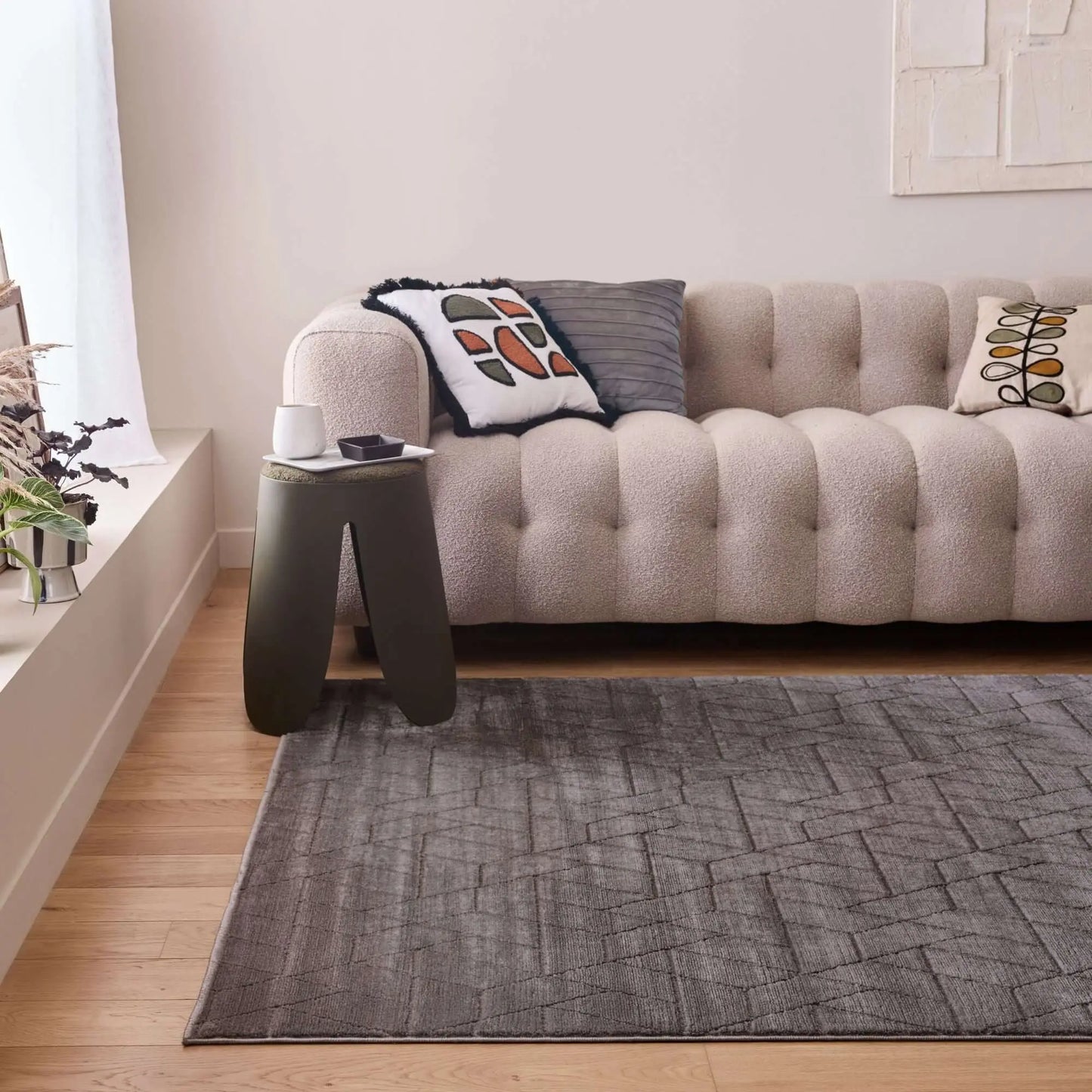 Elevate your home decor with this grey-coloured area rug, a perfect blend of style and functionality. The rug features a soft yet durable pile made from a premium blend of polypropylene and polyester, providing a 9 mm thickness and comfortable cushioning. Its cotton backing ensures long-lasting durability and stability, making it suitable for various spaces, including the living room, kitchen, and bedroom.