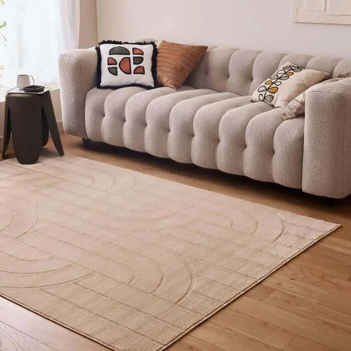 Elevate your home decor with this beige-coloured area rug, a perfect blend of style and functionality. The rug features a soft yet durable pile made from a premium blend of polypropylene and polyester, providing a 9 mm thickness and comfortable cushioning. Its cotton backing ensures long-lasting durability and stability, making it suitable for various spaces, including the living room, kitchen, and bedroom.