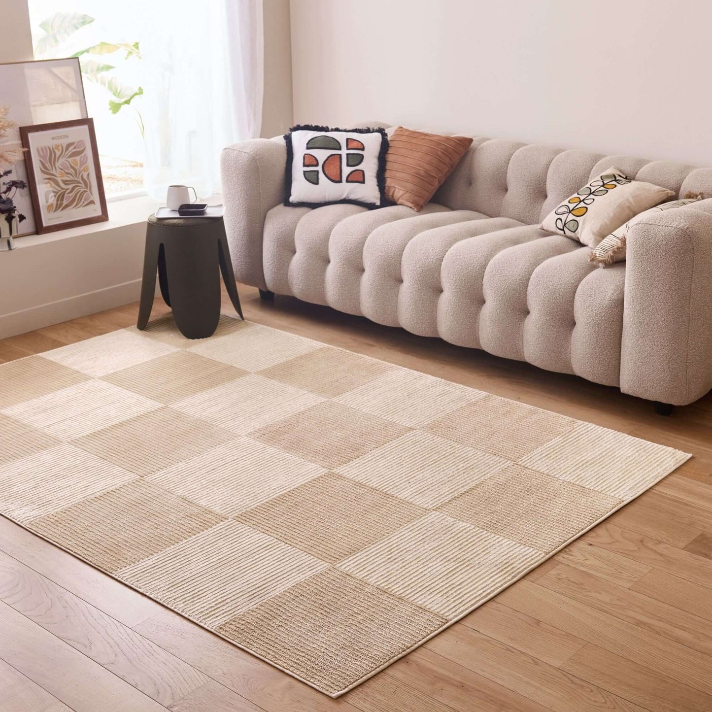 Elevate your home decor with this beige-coloured area rug, a perfect blend of style and functionality. The rug features a soft yet durable pile made from a premium blend of polypropylene and polyester, providing a 9 mm thickness and comfortable cushioning. Its cotton backing ensures long-lasting durability and stability, making it suitable for various spaces, including the living room, kitchen, and bedroom.
