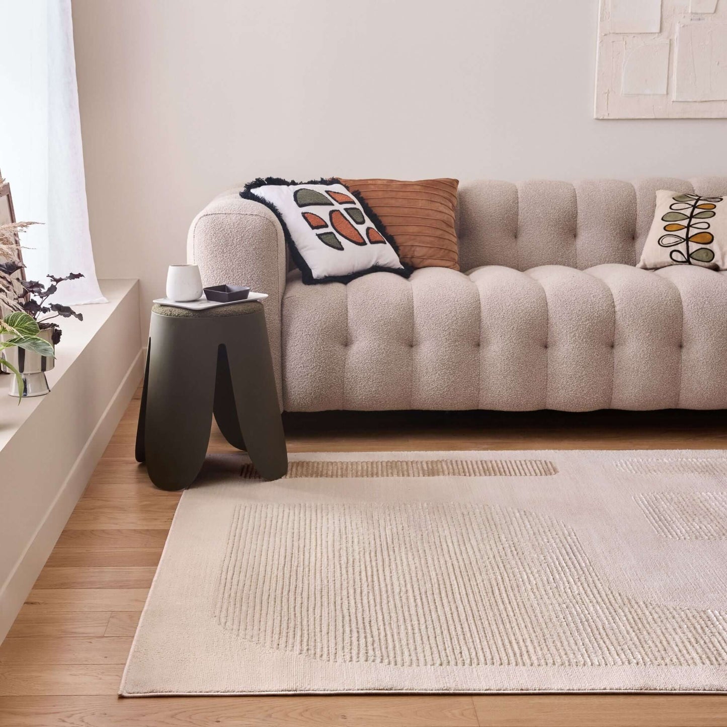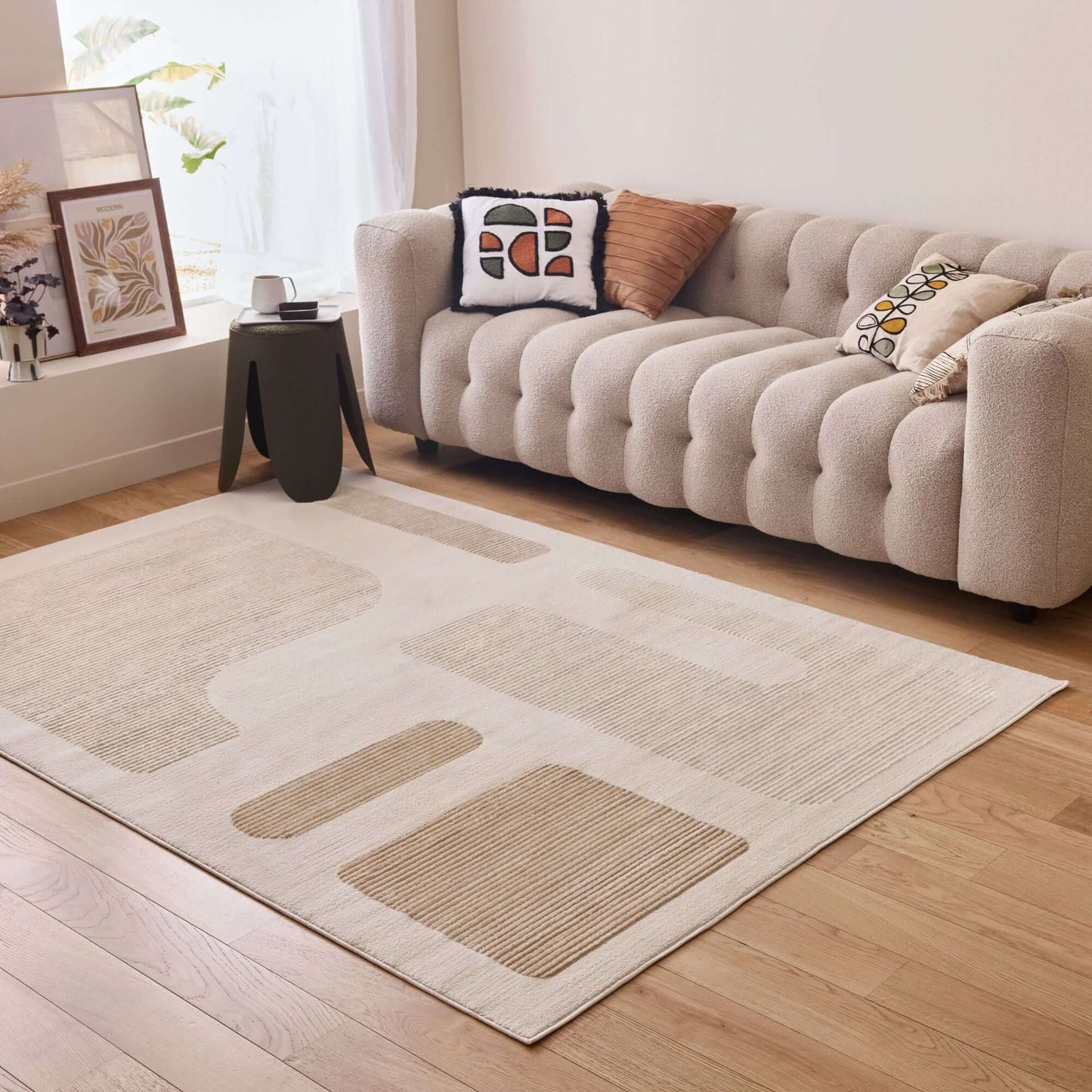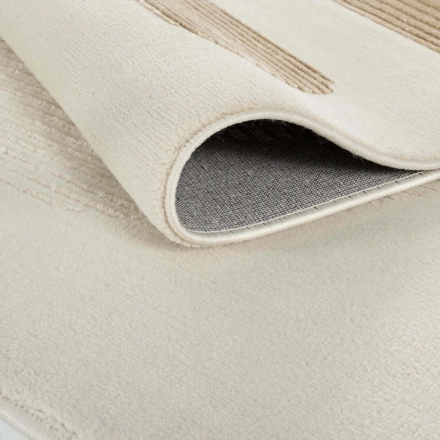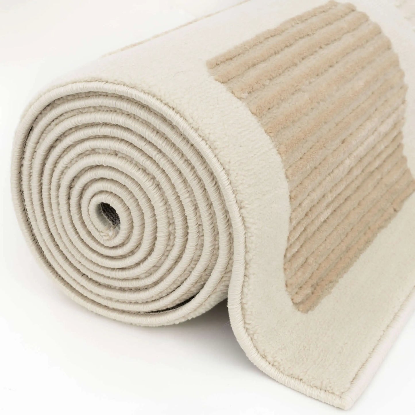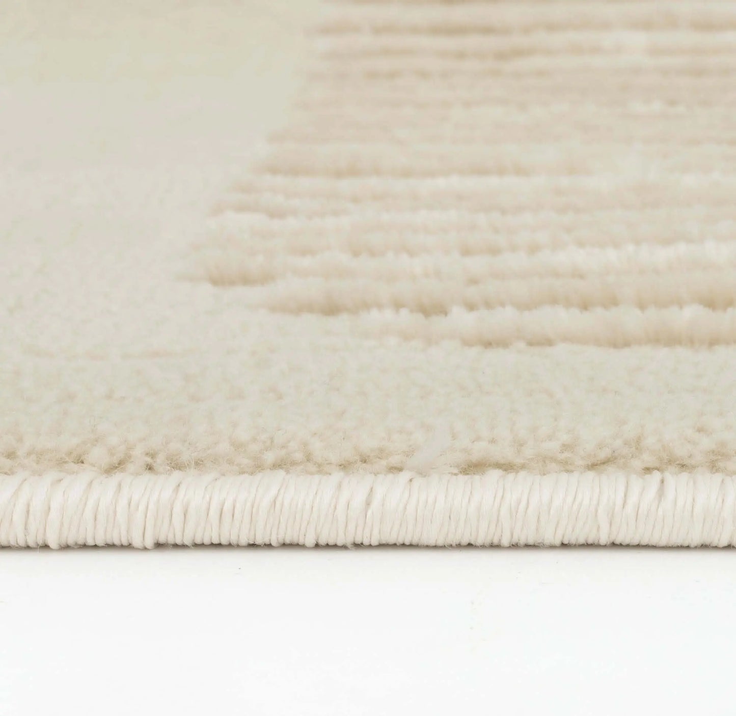 Elevate your home decor with this beige-coloured area rug, a perfect blend of style and functionality. The rug features a soft yet durable pile made from a premium blend of polypropylene and polyester, providing a 9 mm thickness and comfortable cushioning. Its cotton backing ensures long-lasting durability and stability, making it suitable for various spaces, including the living room, kitchen, and bedroom.