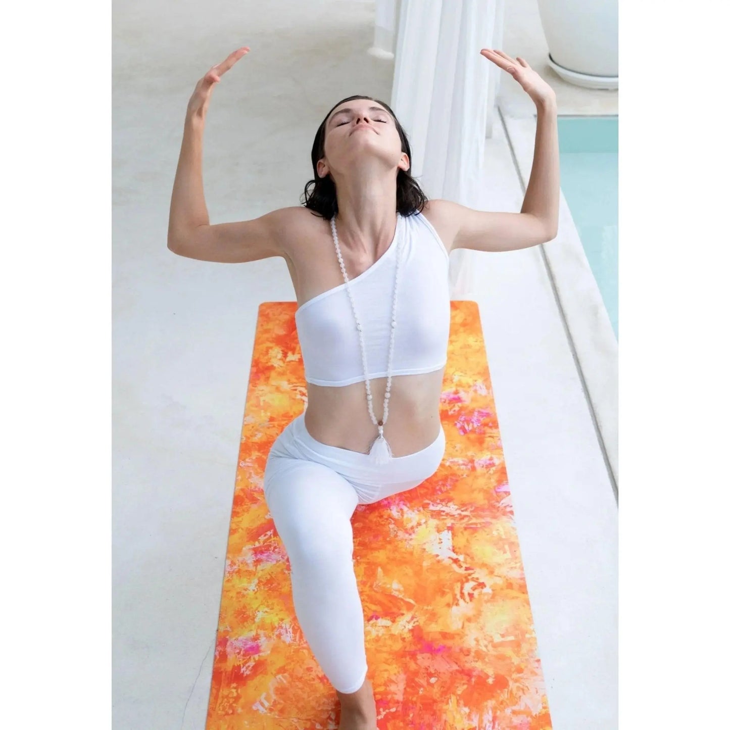 Bright and Colourful Yoga Mat, painted Aurelia artistry. Natural tree rubber yoga mat with sustainable materials, this mat offers superior cushioning which absorbs impact, protecting your joints while providing a firm, supportive and grounding foundation for every pose. Ideal for sweaty practice, hot yoga, Pilates, and other floor exercises, this durable, long-lasting and high-performance mat helps you stay focused, grounded, and comfortable—while being kind to the planet.