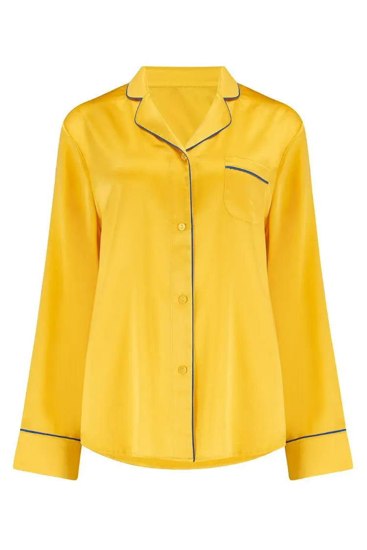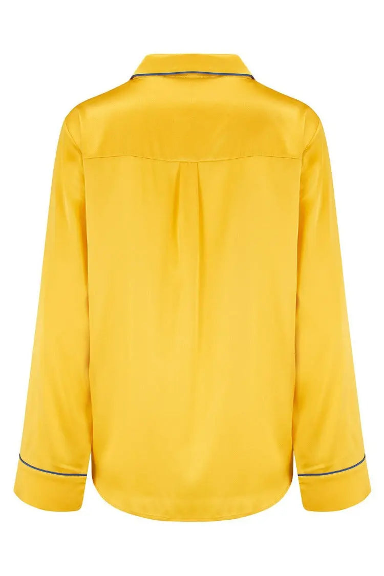 Regular price £90.00Sleepy Wilson understands how invaluable sleep is to your health and overall well-being. Our classic Aurelie Silk Pyjama Shirt in the rich Honeybee is made using the highest quality 19 momme silk, trimmed with contrasting peacock blue piping and adorned with our signature shell buttons.