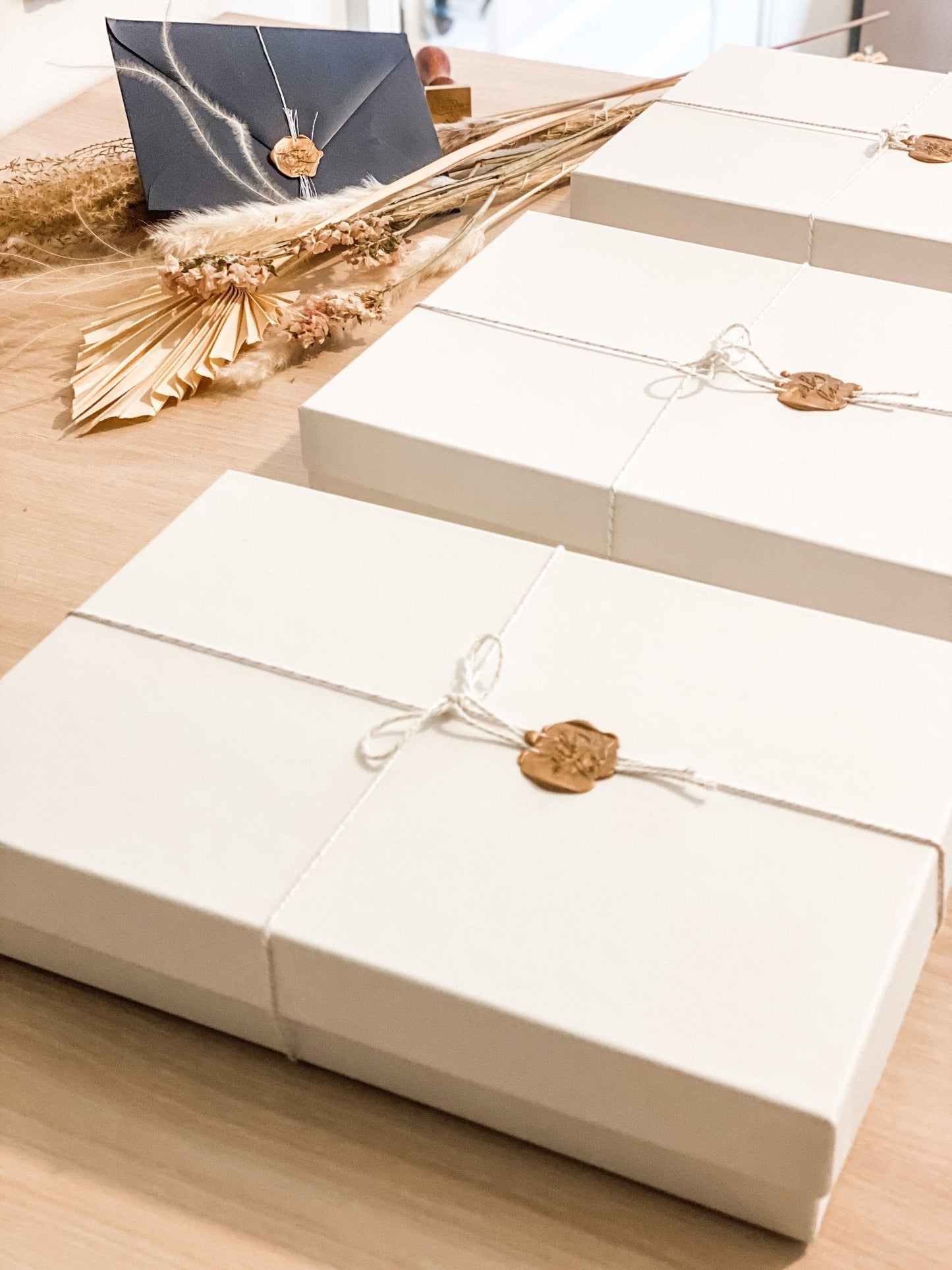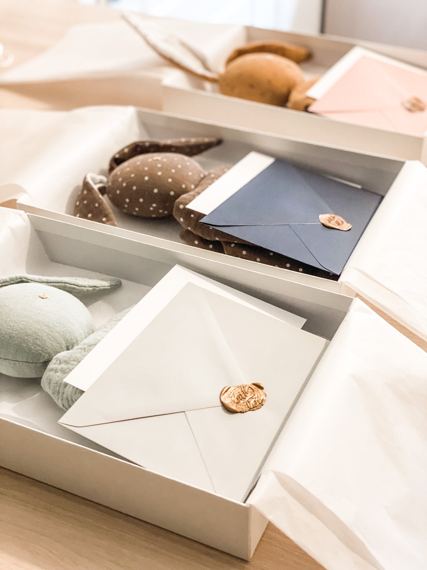 Consists of a powder rose muslin bunny comforter beautifully wrapped in a white gift box sealed with wax stamp. We’ll include a handwritten note with your message.