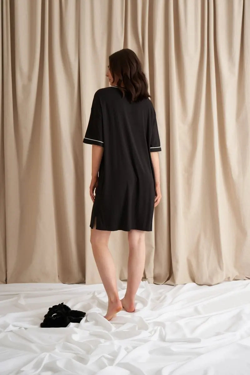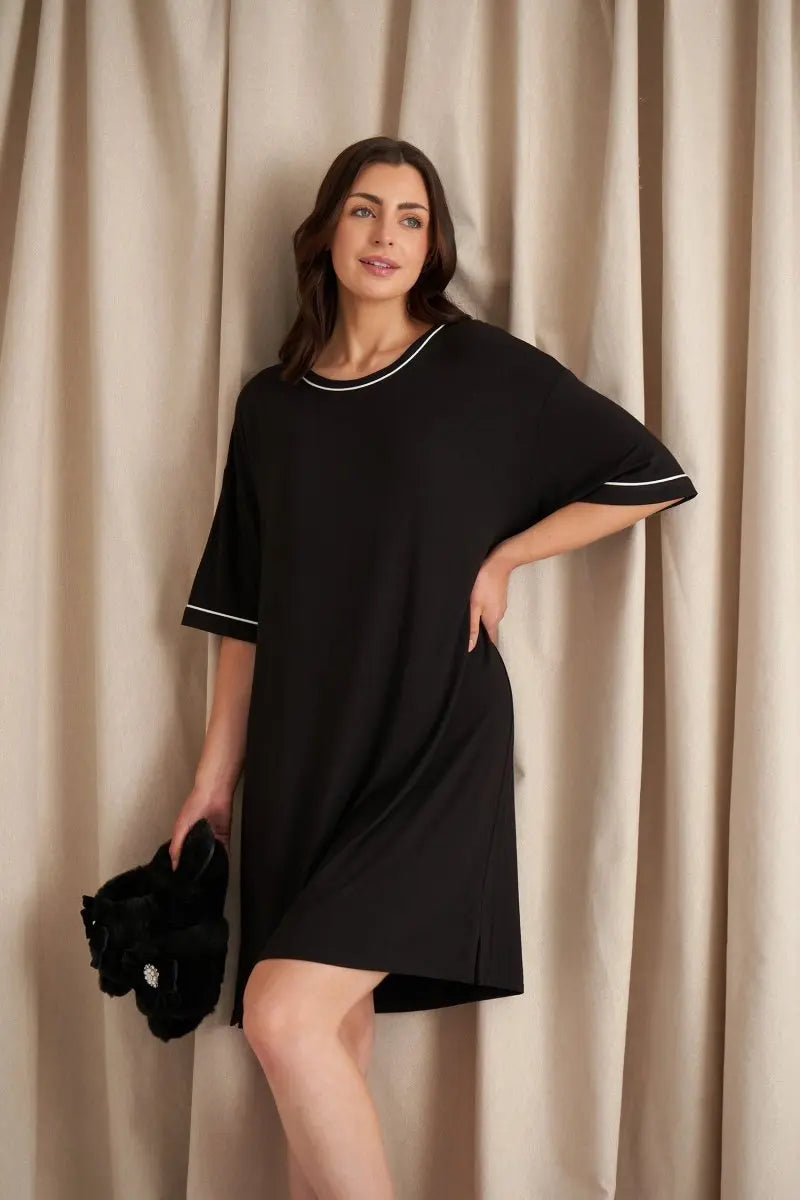 Crafted in a relaxed t-shirt dress style, it offers unparalleled comfort and style. Contrast piping trims delicately adorn the short sleeves and rounded neckline, adding a touch of sophistication to a timeless style. Perfect for lounging and unwinding in ultimate comfort and elegance. Experience luxury with our Bamboo Classic Tee Dress, the perfect choice for your nighttime relaxation. Available in Black, Pink and Midnight.