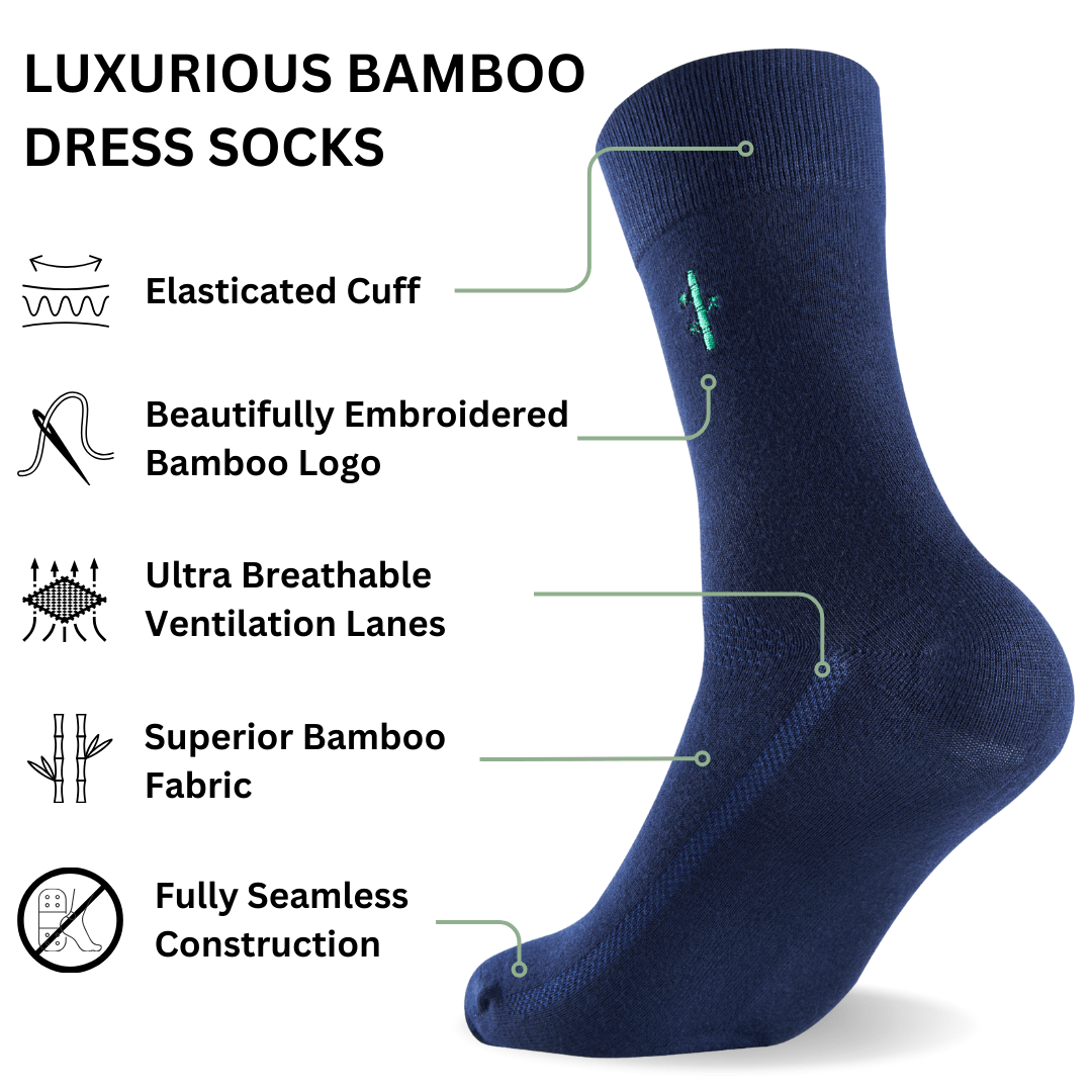 Elevate your sock game with our premium Bamboo Men's Dress Socks. These versatile socks transition effortlessly from boardroom to casual outings, featuring our beautifully embroidered logo. The bamboo fabric delivers unmatched breathability, keeping feet fresh all day. Experience exceptional comfort with super-stretchy bamboo fabric that moves with you. Why settle for ordinary socks when you can enjoy luxury with every step?