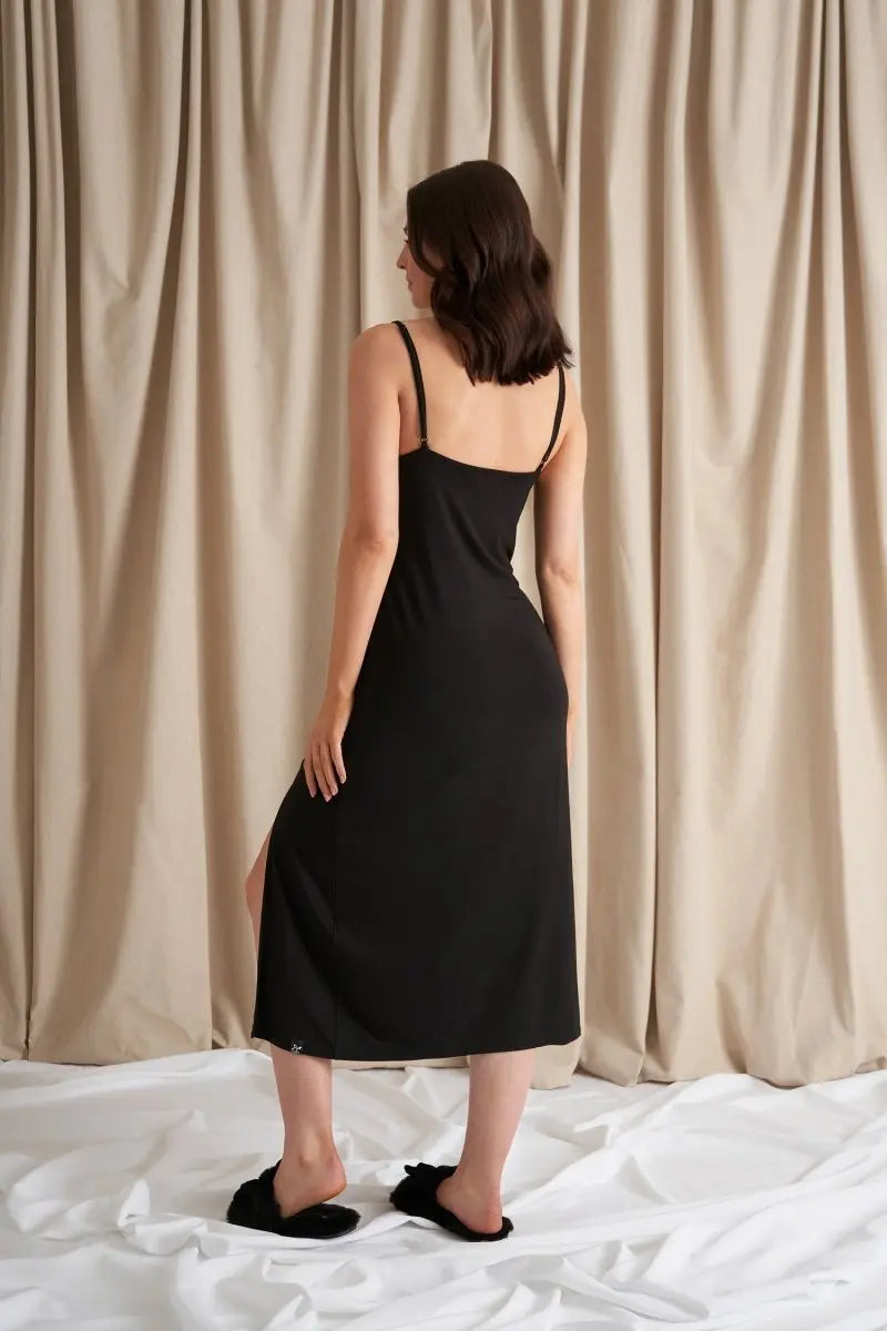 The latest collection to join our best-selling bamboo nightwear range. Crafted with exquisite attention to detail, the Bamboo Frill Chemise features delicate satin frill straps for a touch of feminine luxury. The longer length design and subtle side split offer both elegance and comfort, making it perfect for lounging whilst still feeling glamorous. The slim waist and shaped bust create a flattering fit for all figures. Elevate your sleepwear wardrobe with the sustainably sourced softness of bamboo and timeless charm of the chemise style. Available in Cornflower Blue and Black.