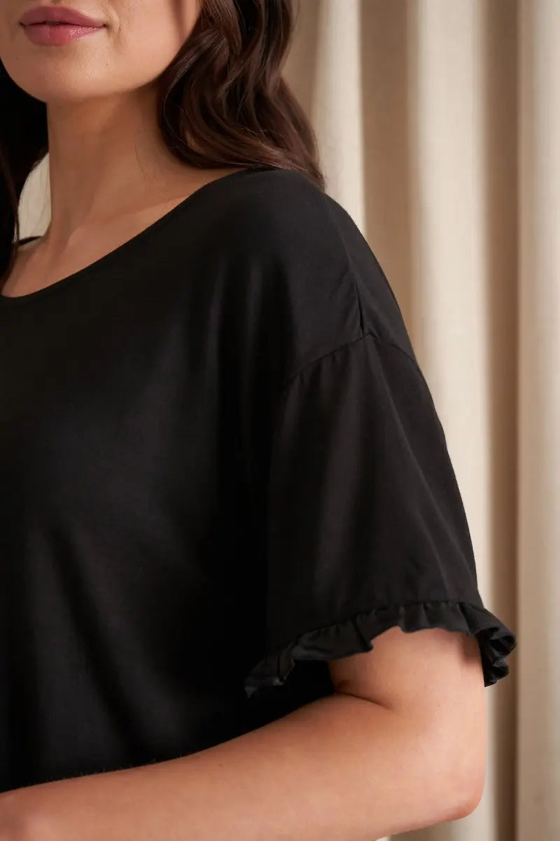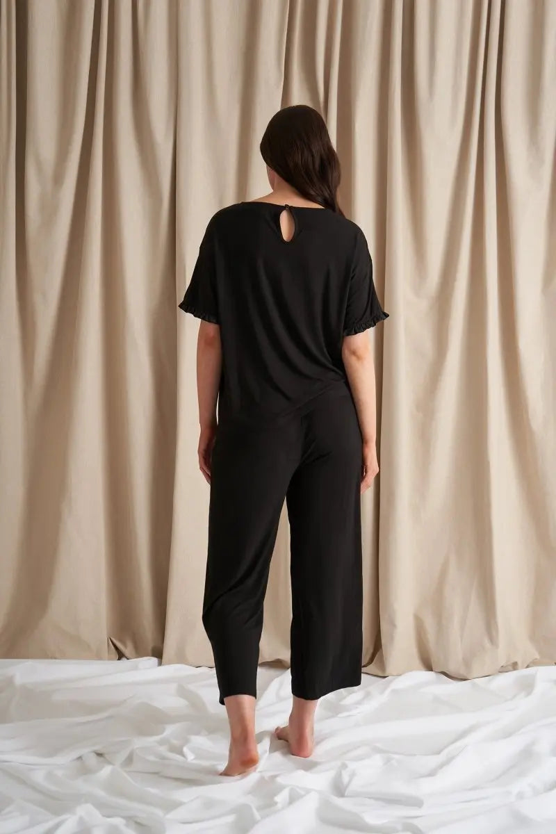 Introducing our Bamboo Frill Tee Trouser Set, the epitome of effortless elegance and comfort. The relaxed fit tee boasts frill-trimmed short sleeves, adding a touch of femininity to a classic silhouette. Paired with cropped relaxed fit trousers, adorned with frill trim on the cuffs for a subtle yet chic detail. Enjoy practicality without sacrificing style with functional pockets and an elasticated waist complemented by satin drawstrings. Whether lounging around the home or drifting off into dreamland, this set ensures comfort and sophistication in every movement. Available in Cornflower Blue, Black and Grey Marl.