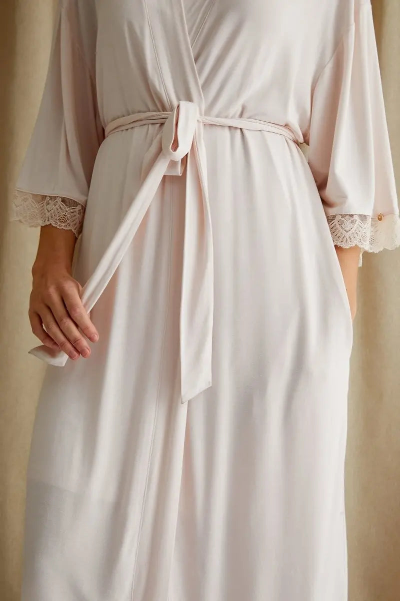 Perfect for evening lounging or layering over your favourite nightwear, it pairs beautifully with the matching Bamboo Lace Chemise and Amelie Slippers for a coordinated, elegant bedtime look.