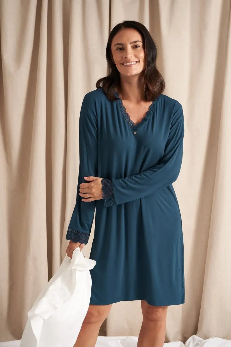 Elevate your sleepwear collection with our Bamboo Lace Nightdress, crafted from our best-selling bamboo fabric. This nightdress features full-length sleeves with delicate lace trim and a relaxed fit for ultimate comfort. The flattering V-neckline is accented with a delicate lace trim, adding a touch of feminine charm. Designed for easy wearing, this above-the-knee length nightdress combines style and comfort effortlessly. Experience the sustainably sourced softness of bamboo and the timeless elegance of this lace-trimmed nightdress.