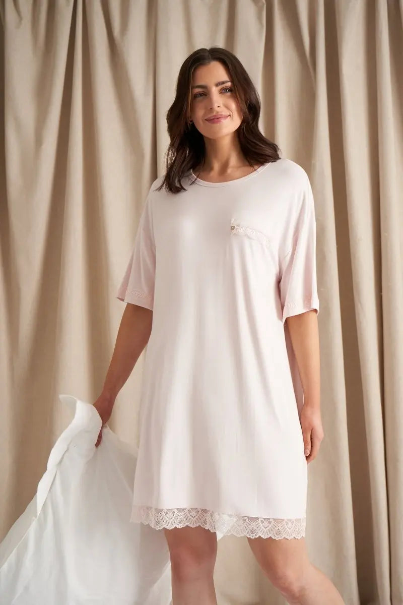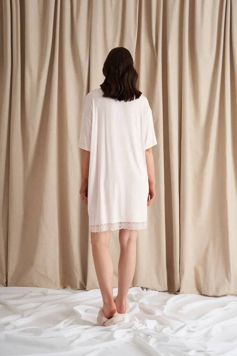 Crafted in a relaxed t-shirt dress style, it offers unrivalled comfort without compromising on style. Delicate lace trims grace the short sleeves and hem, adding a touch of femininity whilst maintaining the perfect length for all heights. Ideal for lounging and unwinding in ultimate comfort and sophistication. Embrace the tranquillity of the night with our Bamboo Lace Tee Dress, the epitome of elegant nightwear. Available in Raven, Powder Puff and Bordeaux.