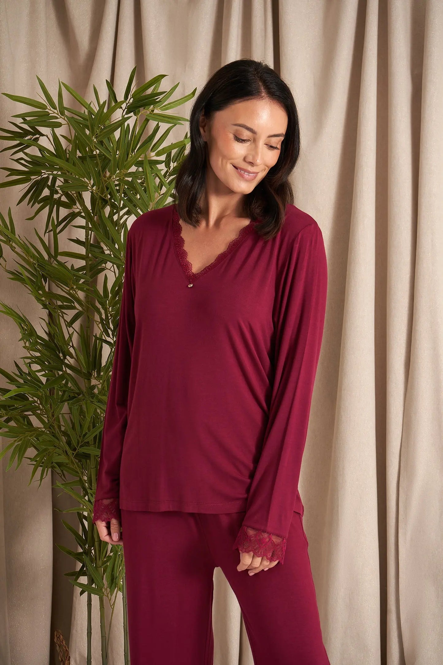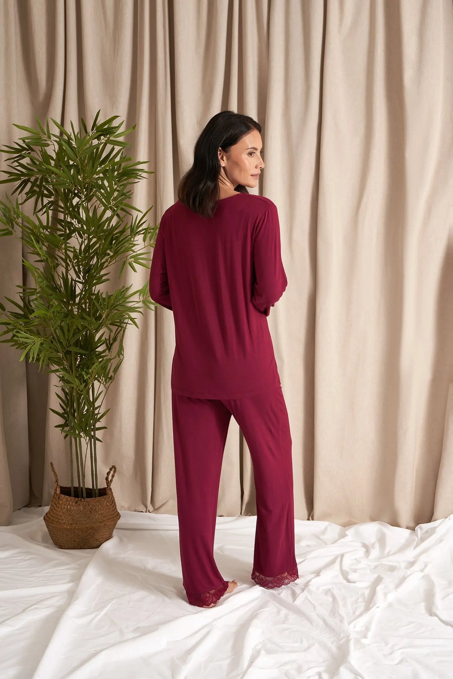 Bamboo Lace V-Neck Pyjama Set in Bordeaux