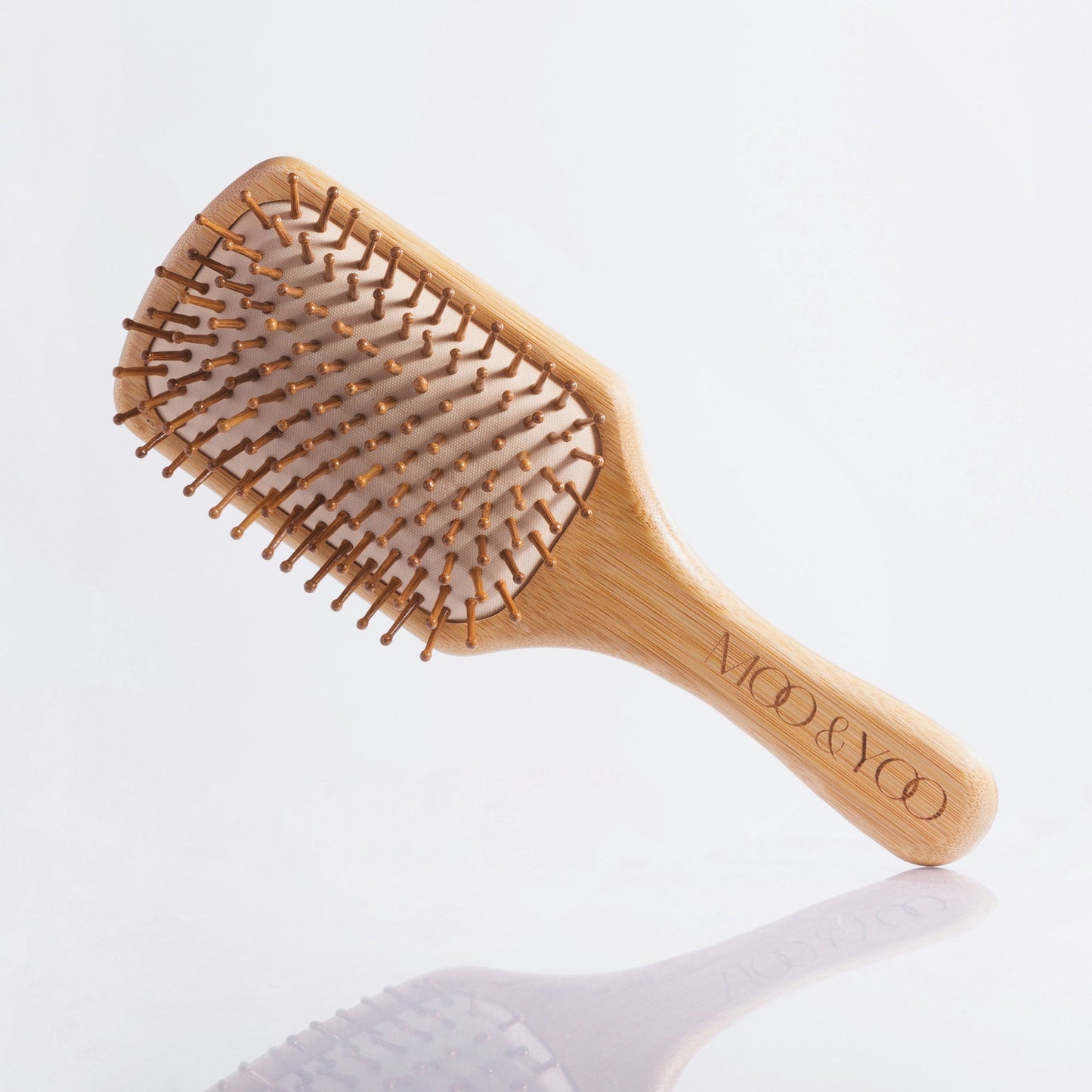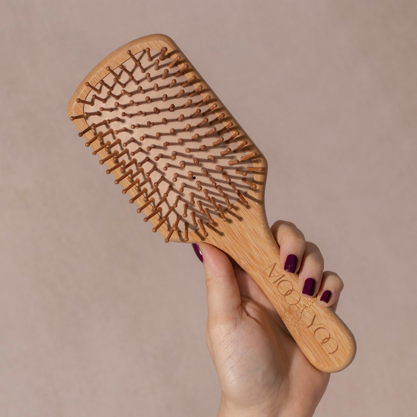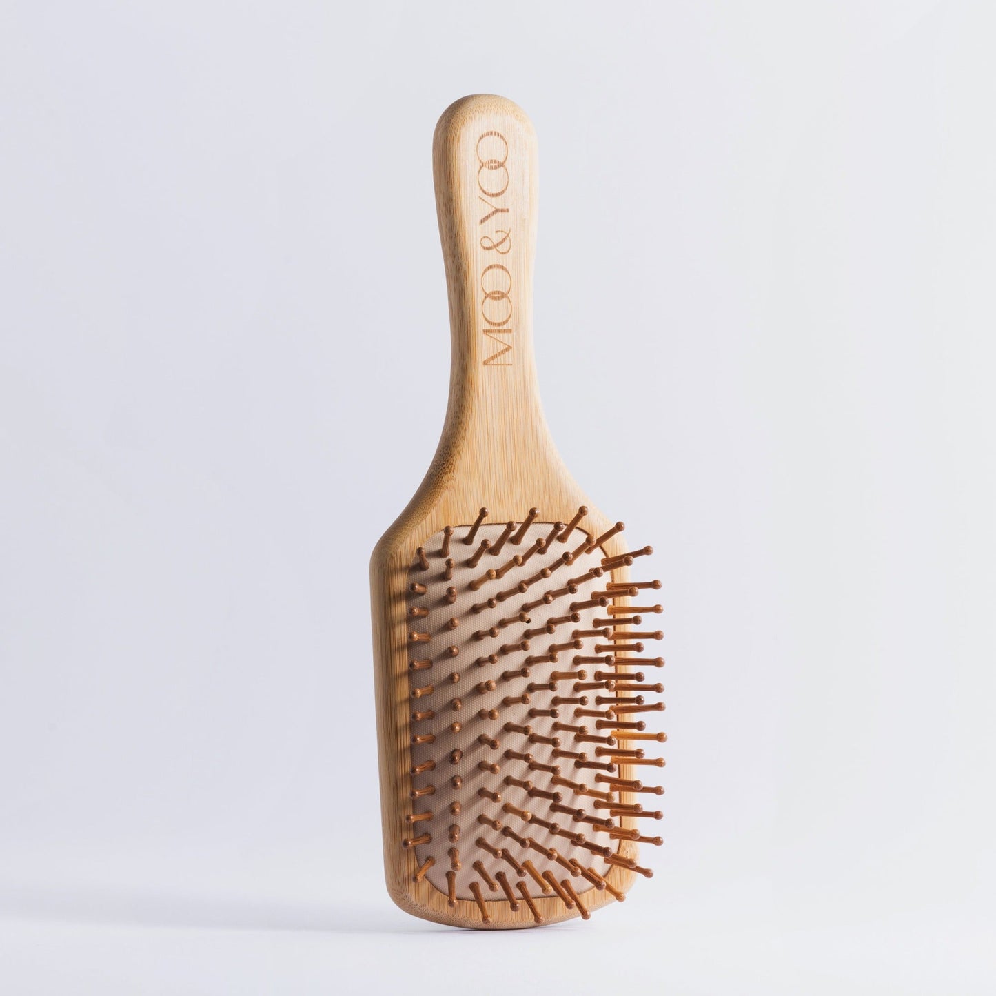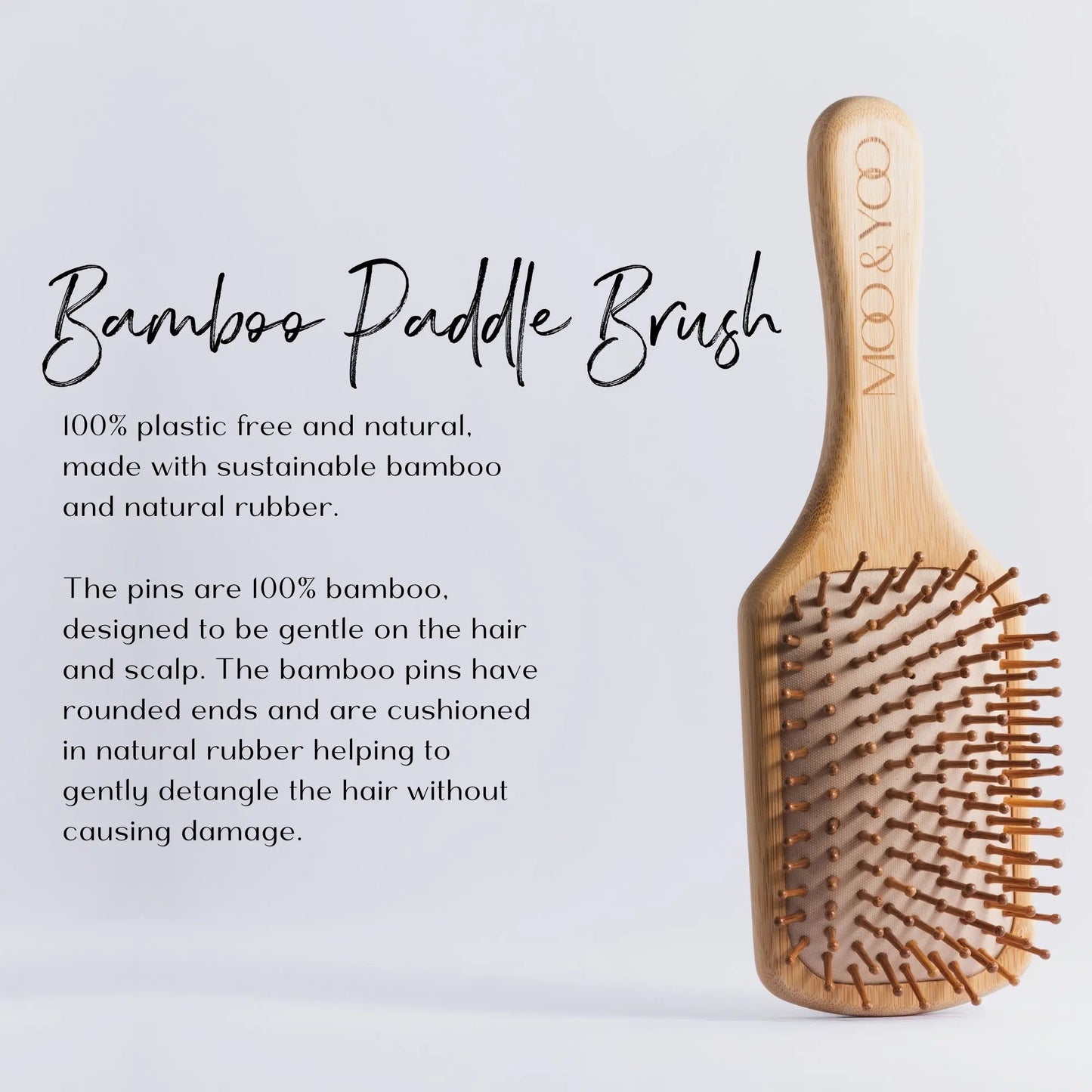 Our bamboo paddle brush is 100% plastic free and natural, made with sustainable bamboo and natural rubber. The pins are 100% bamboo, designed to be gentle on the hair and scalp. The bamboo pins have rounded ends and are cushioned in natural rubber helping to gently detangle the hair without causing damage. The bamboo bristles combined with the cushion of the natural rubber helps stimulate and massage the scalp to promote blood flow promoting a healthier scalp and hair.