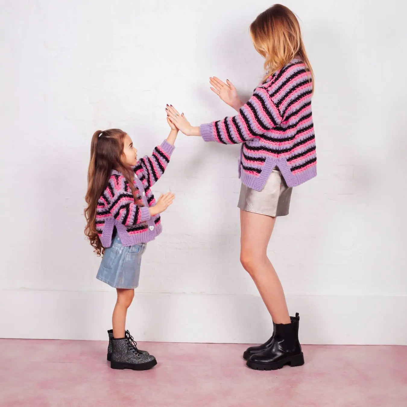 Twinning is winning 💜. Our Bernice Mini Me Cardigan is a pint-sized version of our bestselling striped knit, designed so your little one can match in style. With bold lilac, pink and black stripes, playful heart-shaped buttons and cosy rib trims, it’s the ultimate feel-good knit for mini wardrobes.