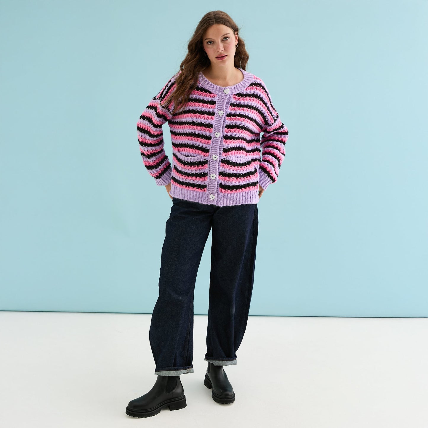 Ready to add some colour to your knitwear rotation? Bernice is your feel-good fix 💜. A bold striped cardigan in lilac, pink and black, finished with playful heart-shaped buttons and chunky rib trims for that extra touch of fun. Designed with a very relaxed, oversized boxy fit, she’s cosy, comfy and full of dopamine-dressing energy.