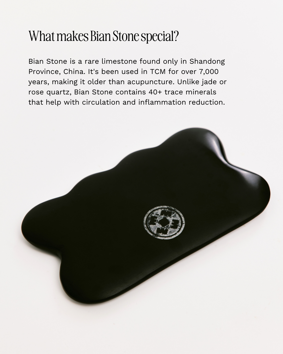Crafted from Bian stone, a healing material revered for over 2,000 years in Traditional Chinese Medicine, this tool is designed to stimulate Qi (energy), release tension, and support skin health from within.
