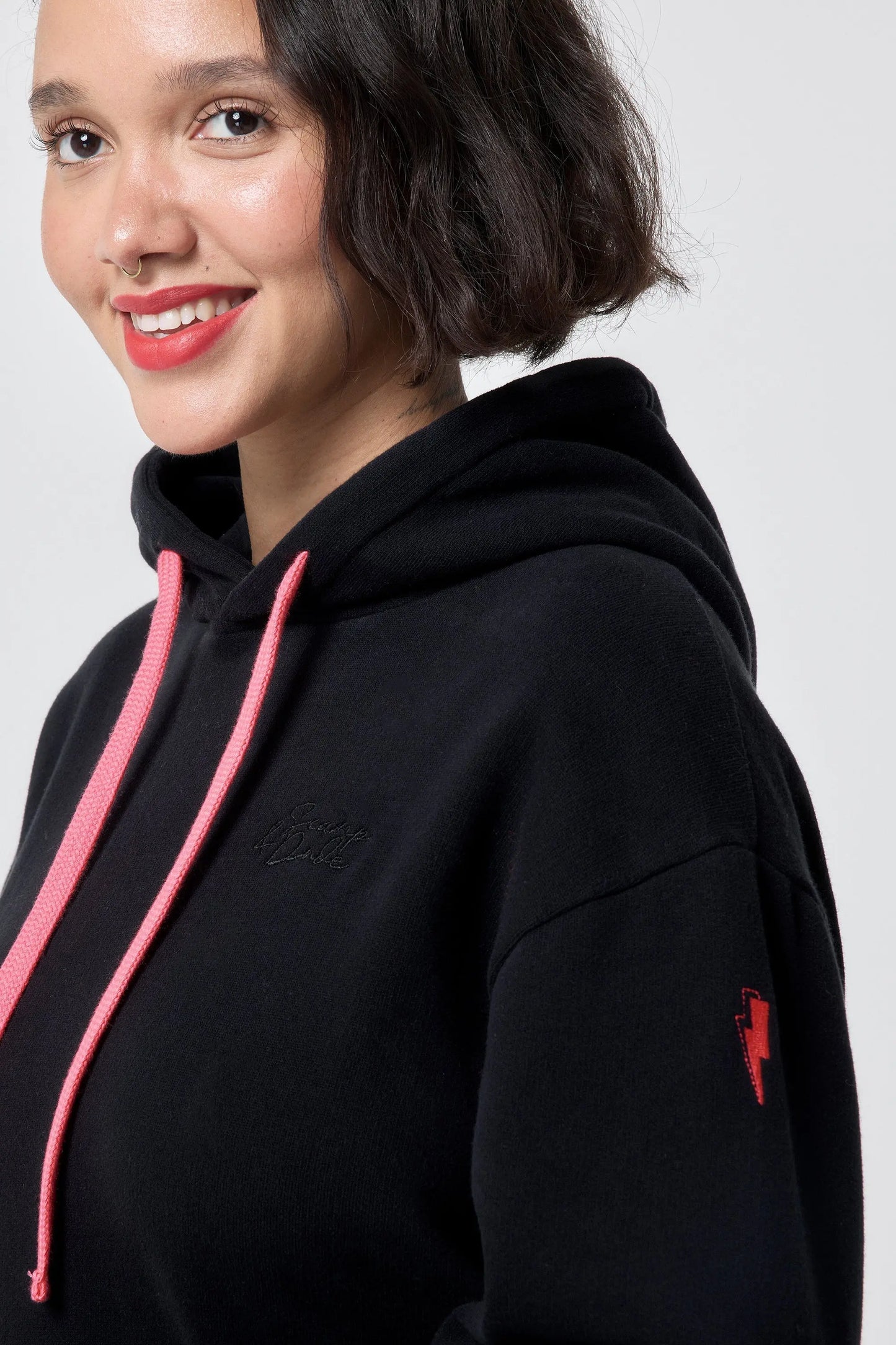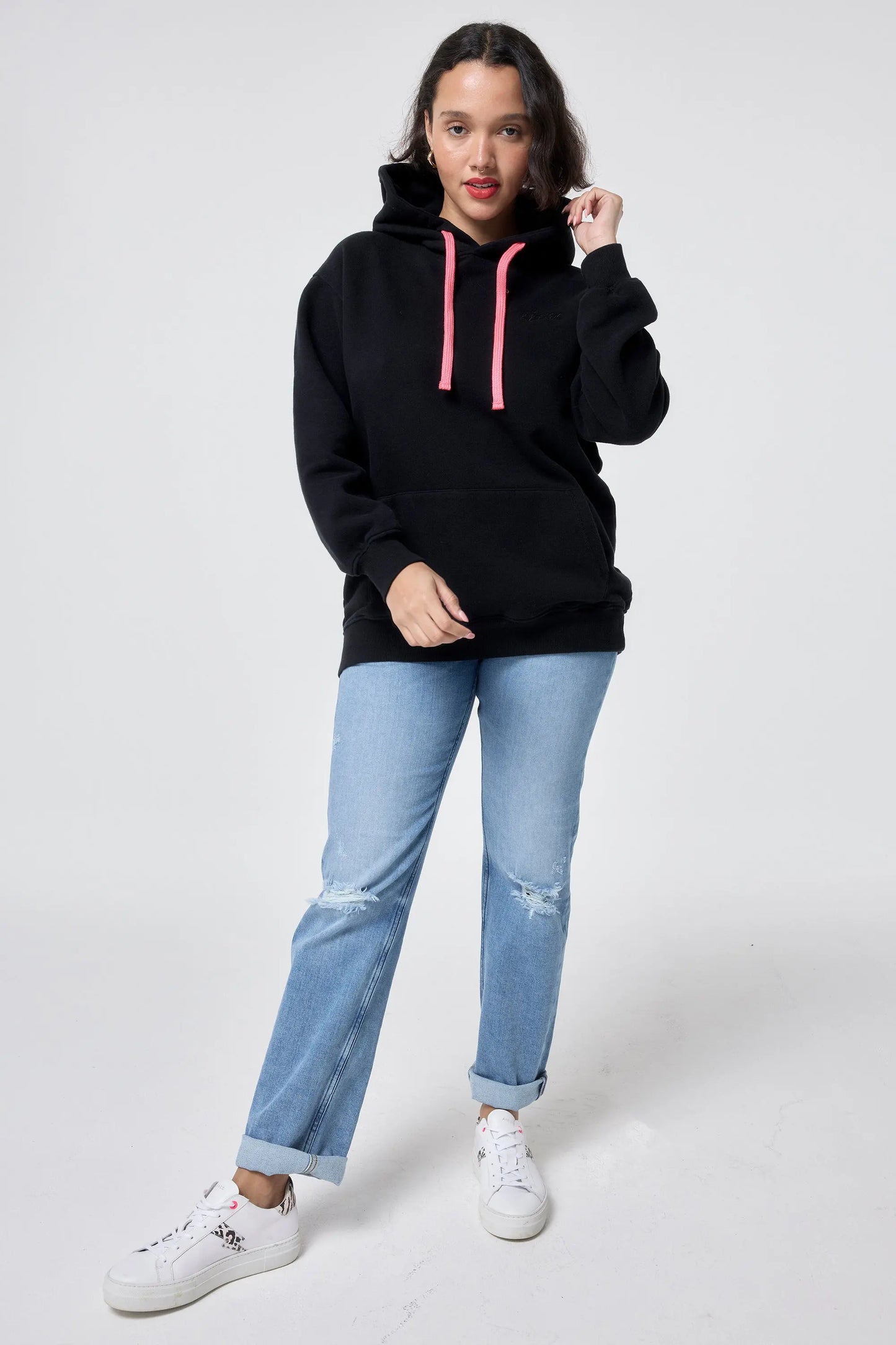 The ultimate throw-on-and-go layer, this black longline hoodie delivers a relaxed fit with an on-trend longer length. Featuring a dropped shoulder for a slouchy silhouette, a sizeable hood with cross-over neck, and bold neon coral drawstrings, it’s the perfect blend of comfort and style for everyday wear.