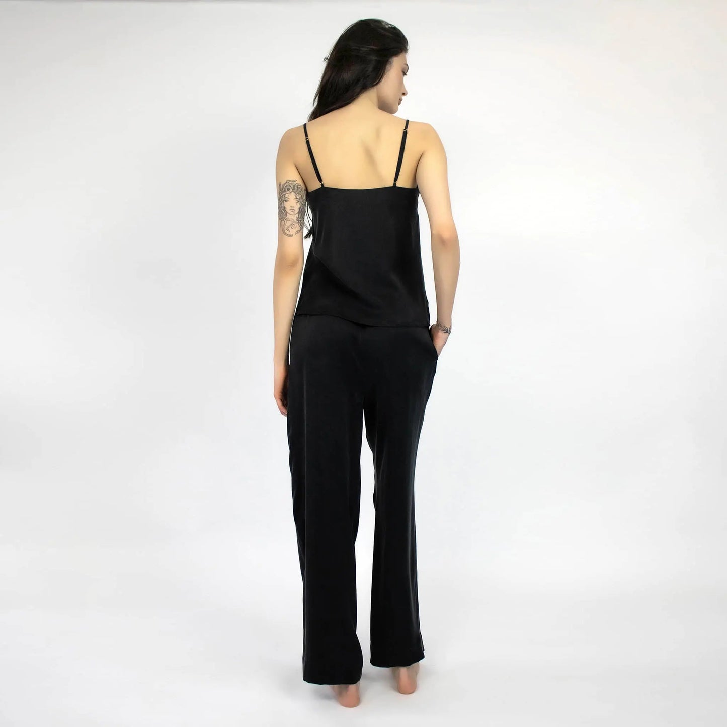 Сlassy silk pyjama pants feature a relaxed straight cut in an essential, elegant black colour, a favourite for all seasons.