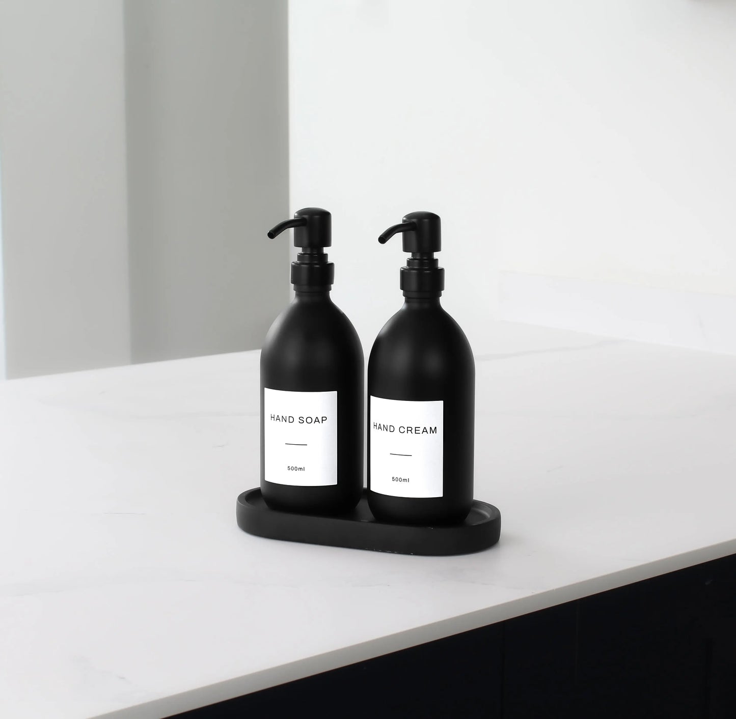 This Matte Black Glass Dispenser Double Set, featuring a Black Concrete Tray, provides a stylish and practical solution for storing and dispensing soap. With a range of label and pump options, it ensures fragile items are kept safe on worktops and countertops in bathrooms and kitchens. Expertly designed and crafted, this set is a must-have for any home.