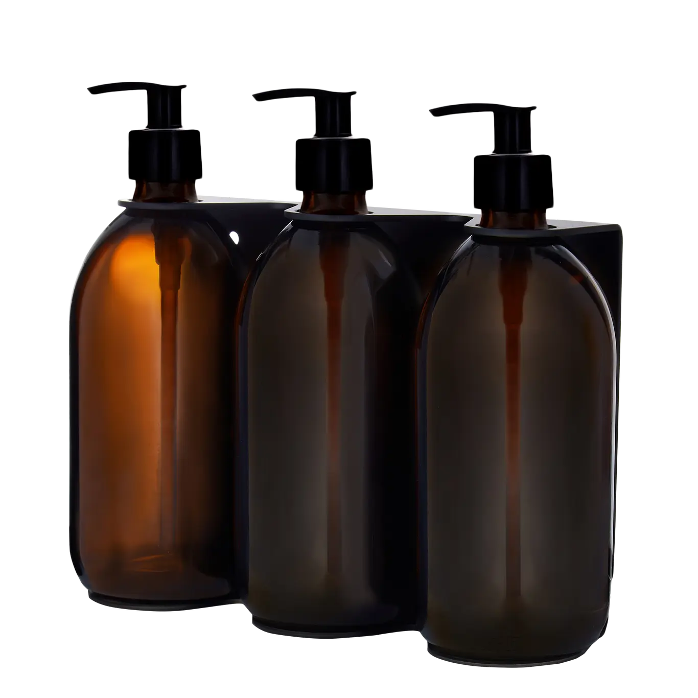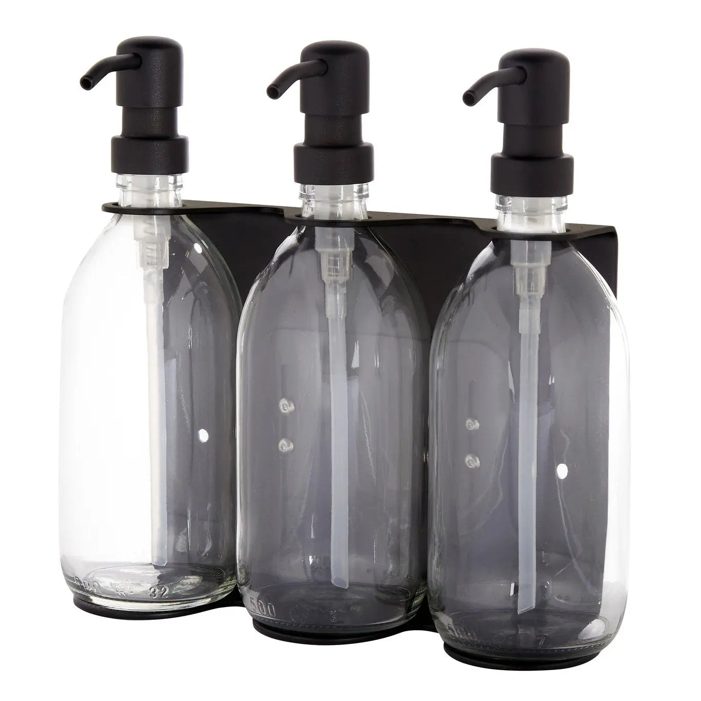 Introducing our black triple wall-mounted soap dispenser, designed to keep your soap always within reach. This triple wall-mounted holder, featuring three refillable glass bottles, is perfect for optimising space and enhancing any bathroom or space's clean, modern aesthetic.