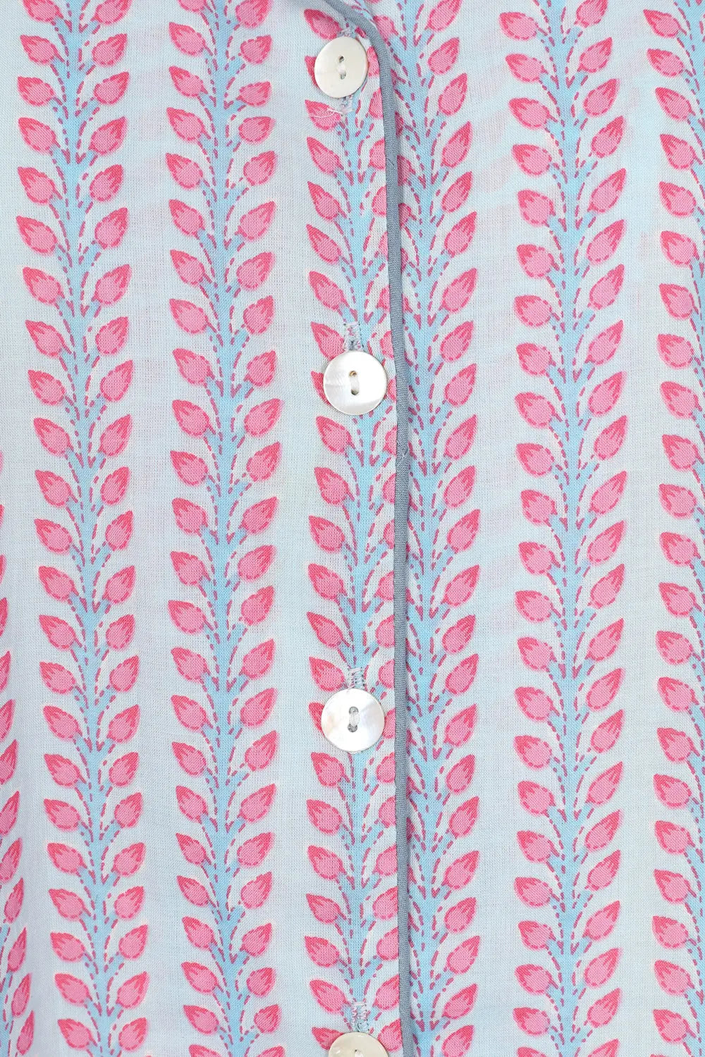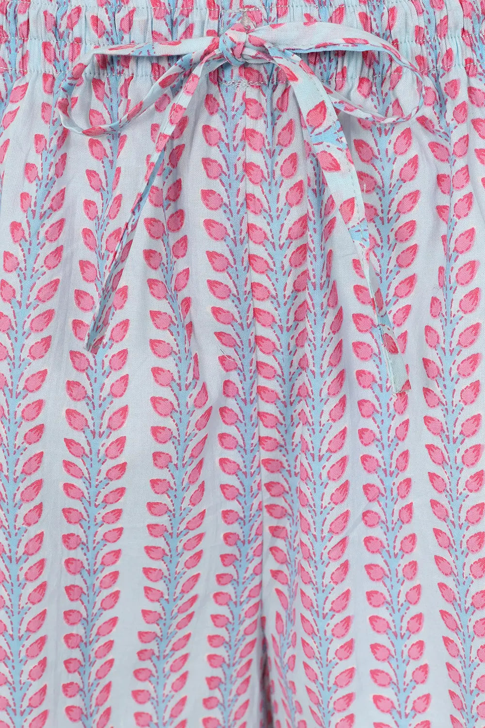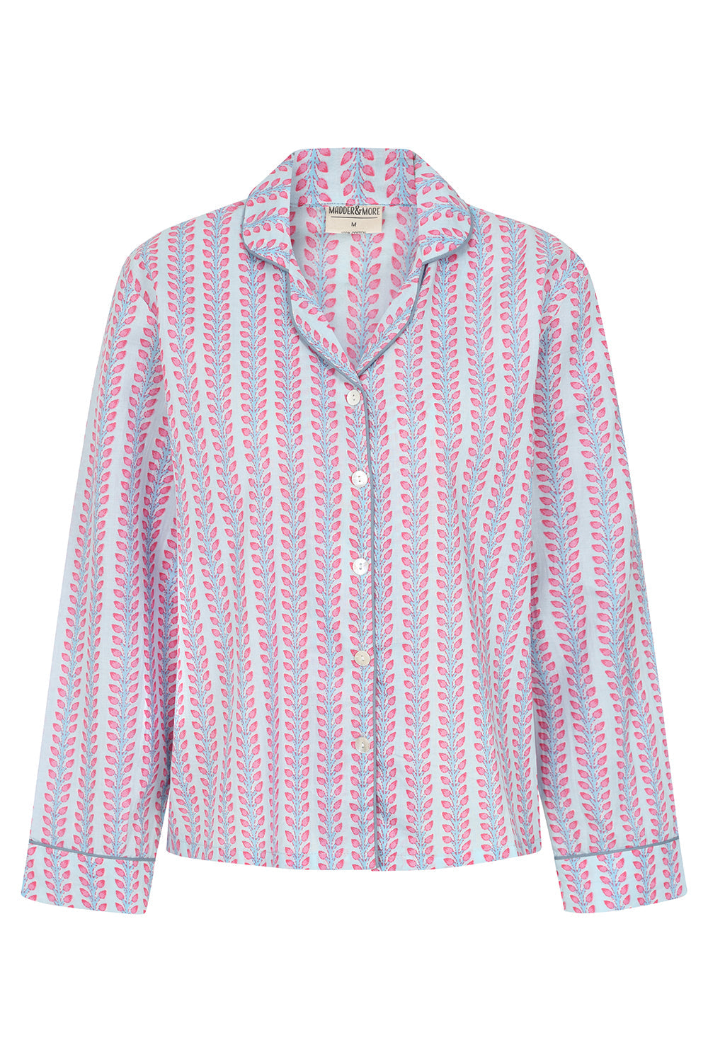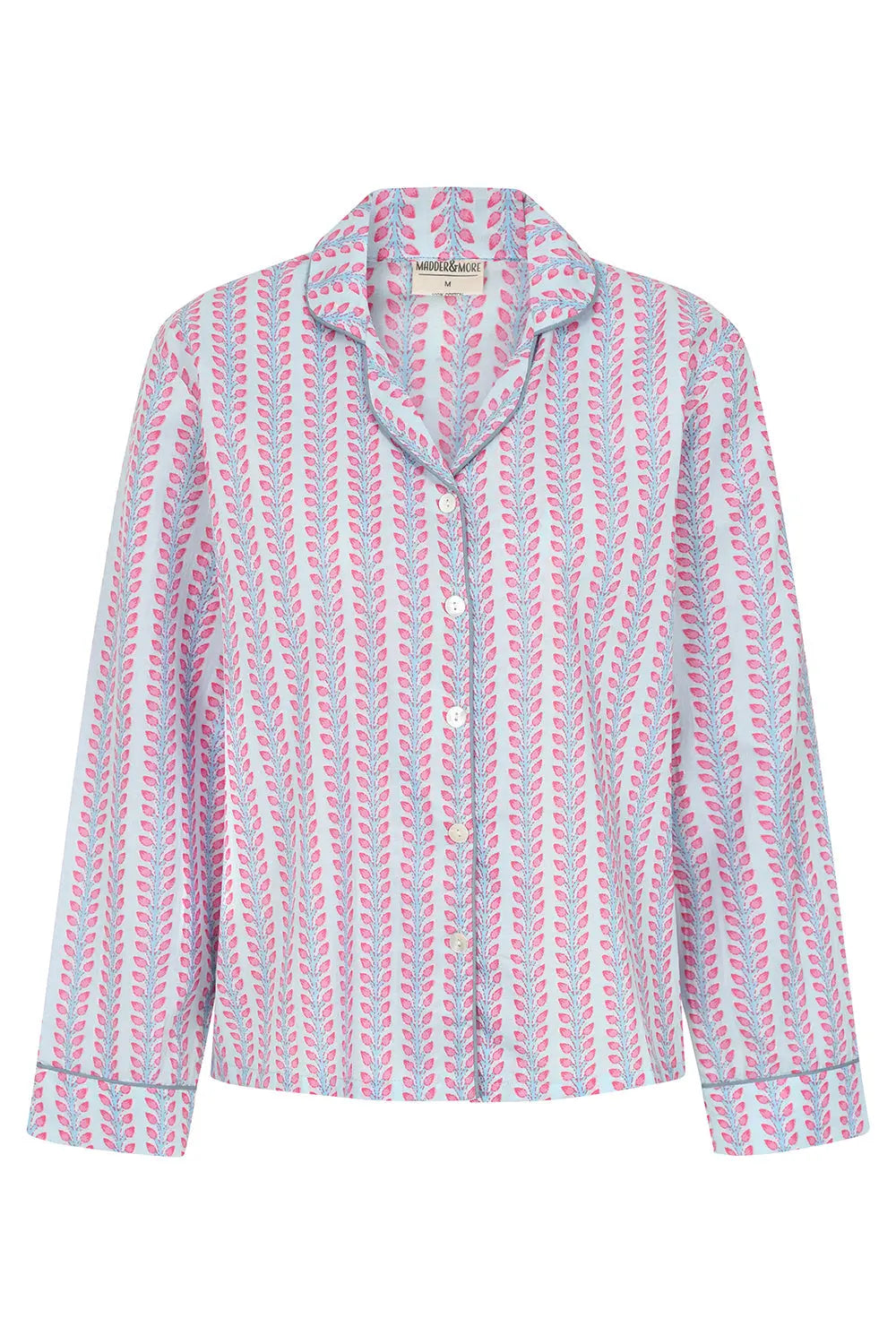 Our pink and blue floral stripe brings together the classic striped pyjama with traditional block printing designs, adding a modern twist to the ancient craft. All our pyjamas are handmade by artisans in Jaipur and come in a matching pyjama bag. Their oversized, boxy fit and supersoft cotton are perfect for cosy nights in. The fabric is hand printed so please allow for discrepancies in designs as each set is unique.