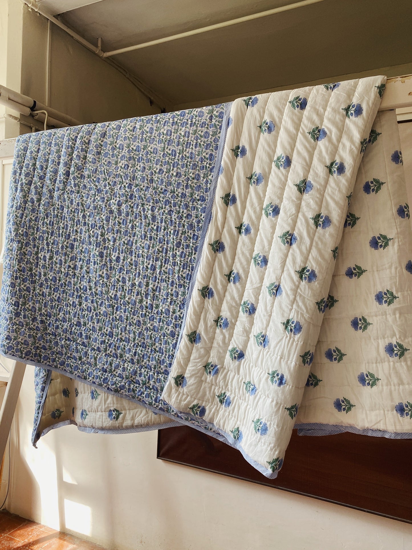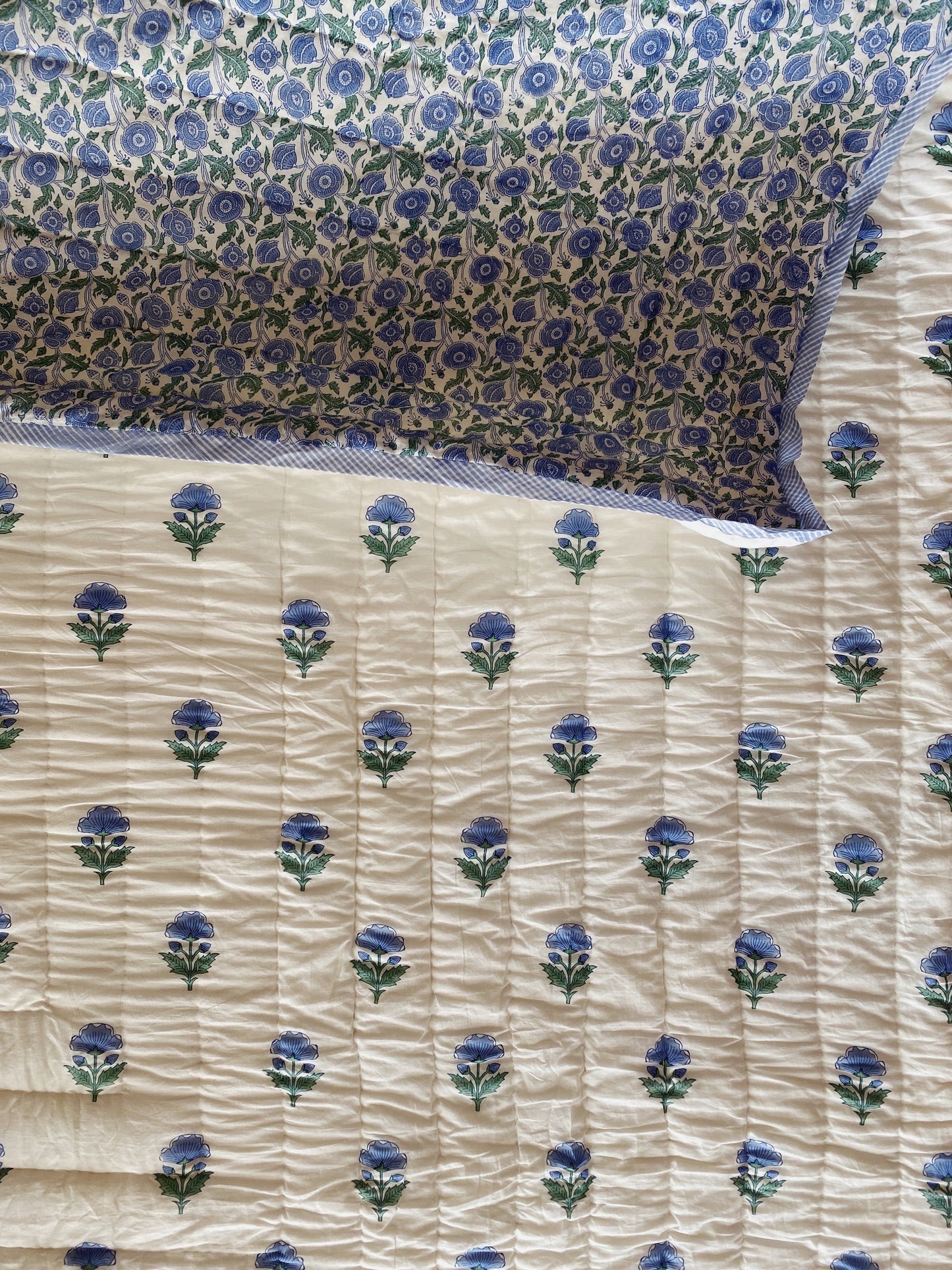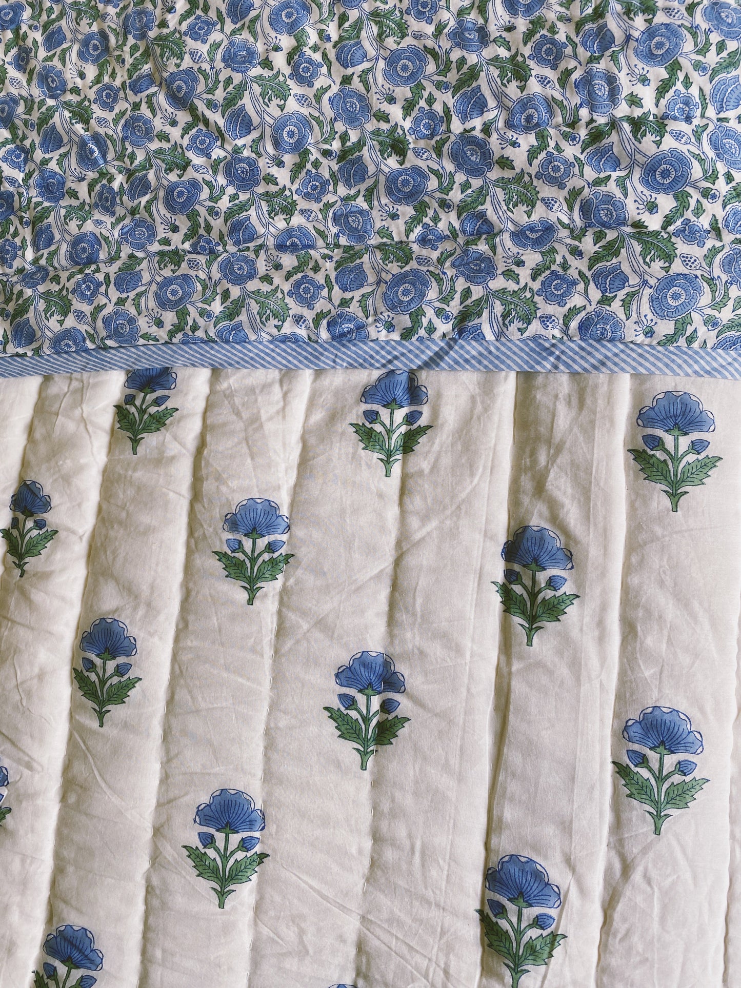 A beautiful and reversible block printed organic cotton bed quilt. This print is a lovely blue butti print on one side with a green and blue floral print on the other. The quilts not only look beautiful over your bed but also add an extra layer of warmth. In the Summer we sleep with just a sheet and a quilt instead of a duvet!