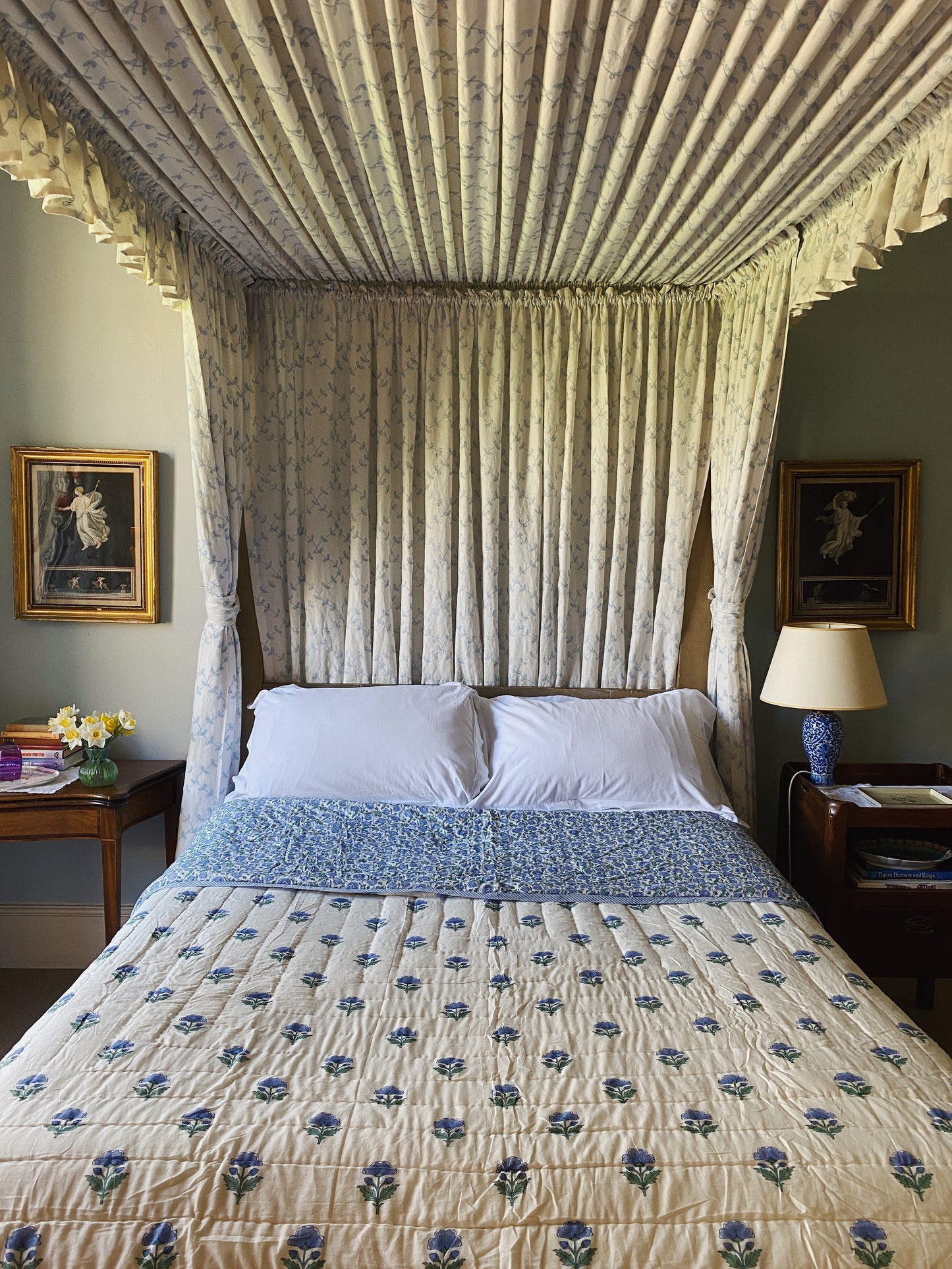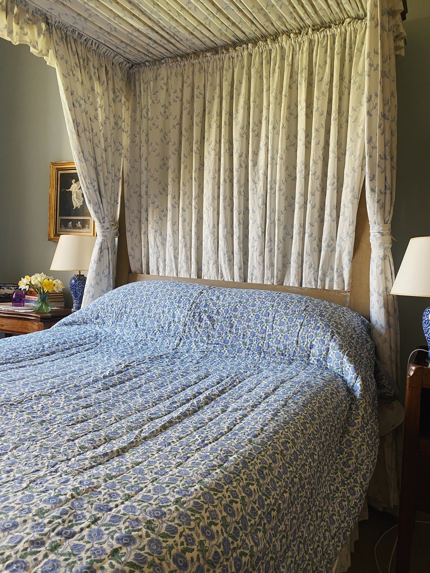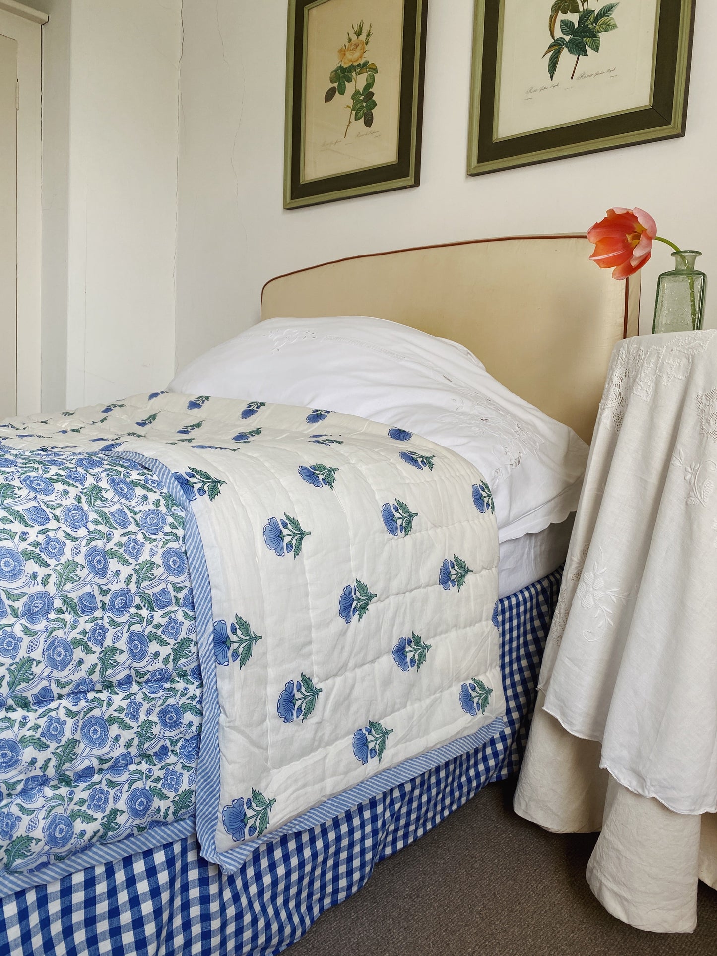 A beautiful and reversible block printed organic cotton bed quilt. This print is a lovely blue butti print on one side with a green and blue floral print on the other. The quilts not only look beautiful over your bed but also add an extra layer of warmth. In the Summer we sleep with just a sheet and a quilt instead of a duvet!