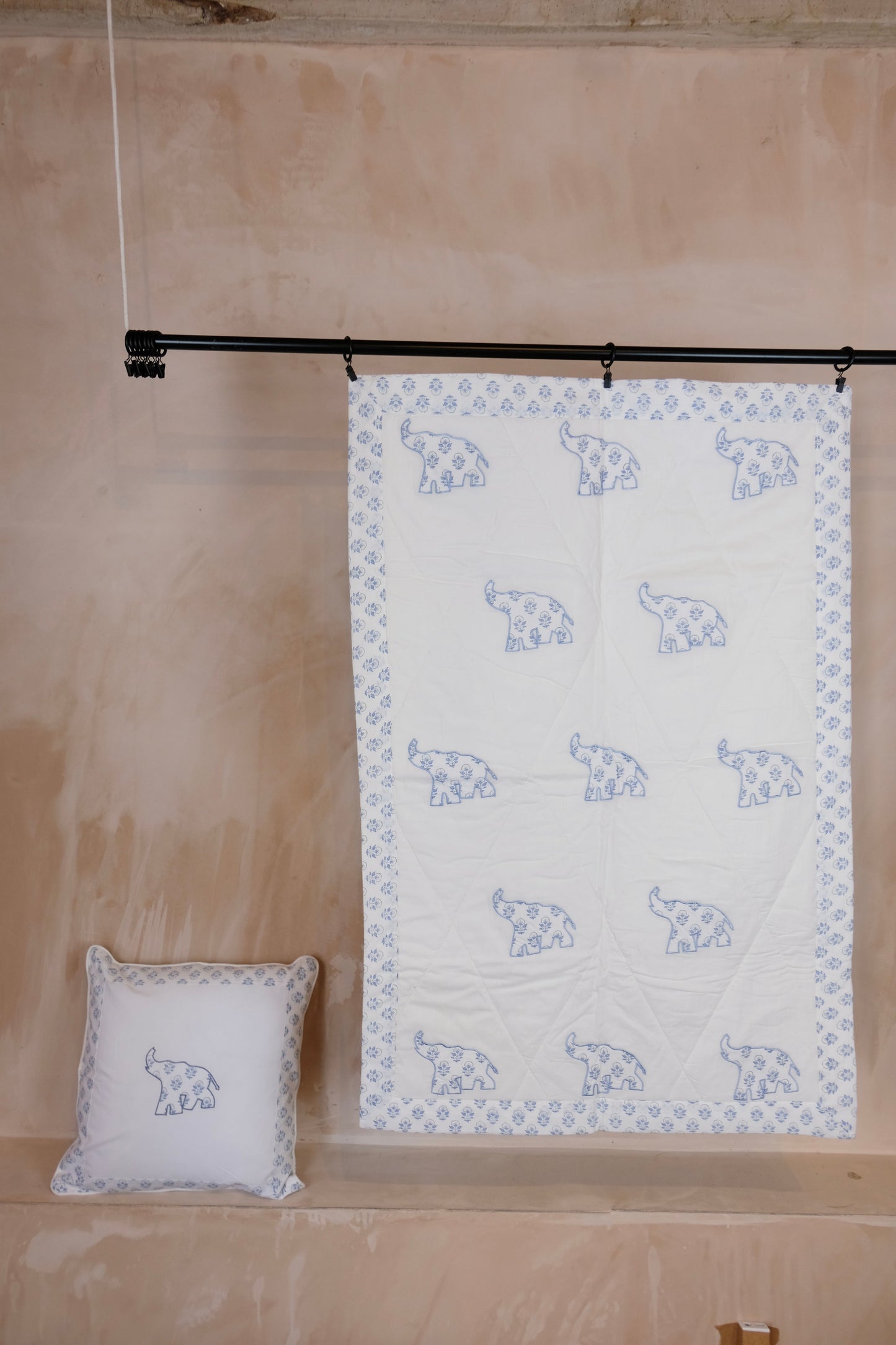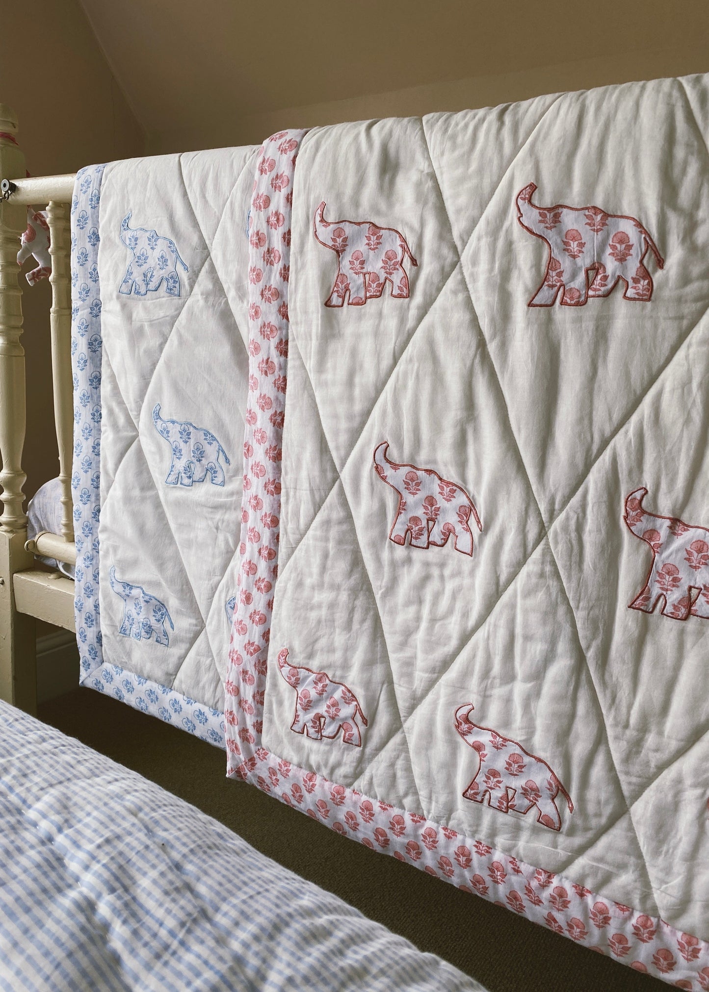 Our new cot quilts make the sweetest gift for newborns or baby’s. They are made of a very soft organic cotton and have appliquéd block print elephants on one side and solid block print on the other. They can be used both in the cot, as a play mat in the nursery or a pram blanket.