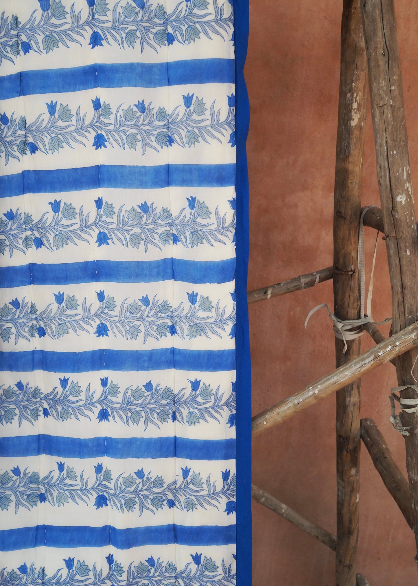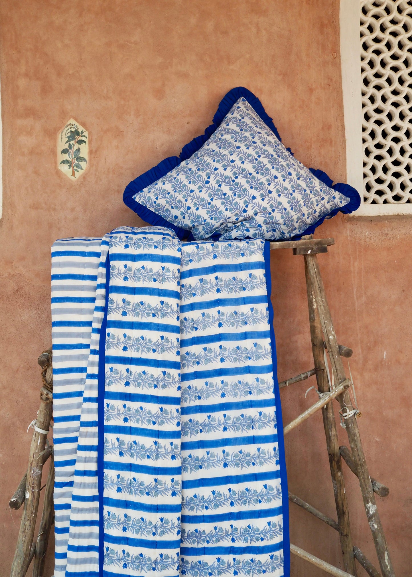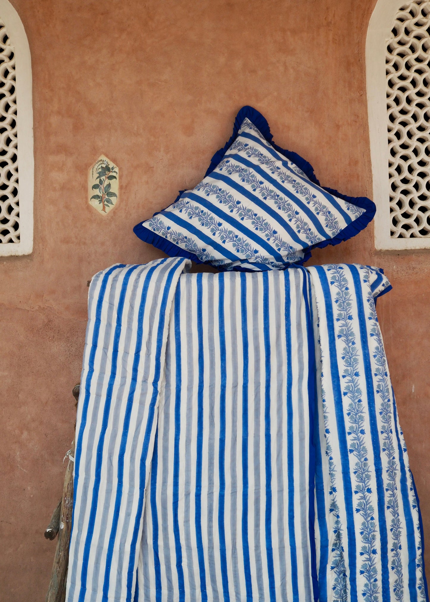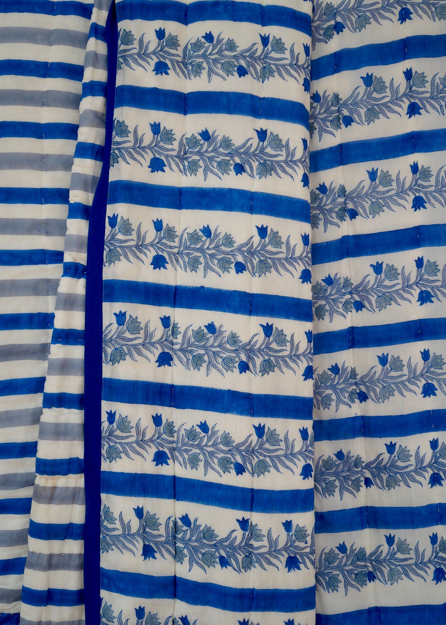 Elevate your bedroom with this exquisite, reversible block-printed organic cotton quilt. Designed in-house and exclusive to Kapara, this piece features a statement blue floral vine print and stripe on one side and a complementary blue-grey pattern on the reverse.