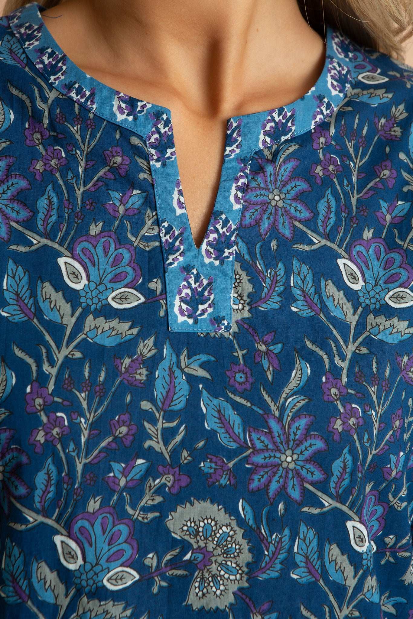 Our Blue Lagoon women's cotton pyjamas set is inspired by blue crystal Icelandic glaciers. These luxury pjs feature a 3/4-sleeve, split neckline loose top and straight leg pyjama bottoms with pockets, which are carefully printed and pre-washed, leaving the soft and breathable 100% Indian cotton a dream to wear. Our bold printed loungewear compliments both your early nights and late mornings.