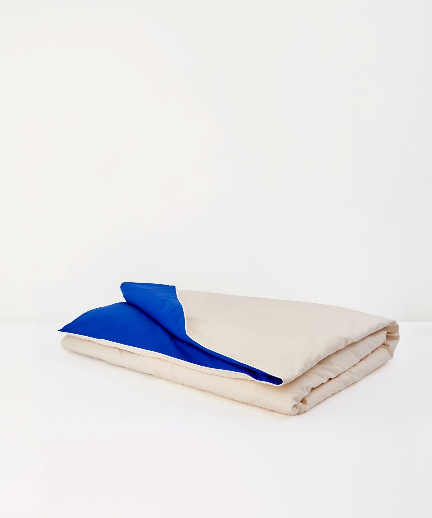 Reversible duvet cover made from our signature cotton and TENCEL™ fabric. Electric blue on one side and peach on the other. The percale weave feels super soft yet crisp against your skin, wash after wash. Features white piping around the edges.