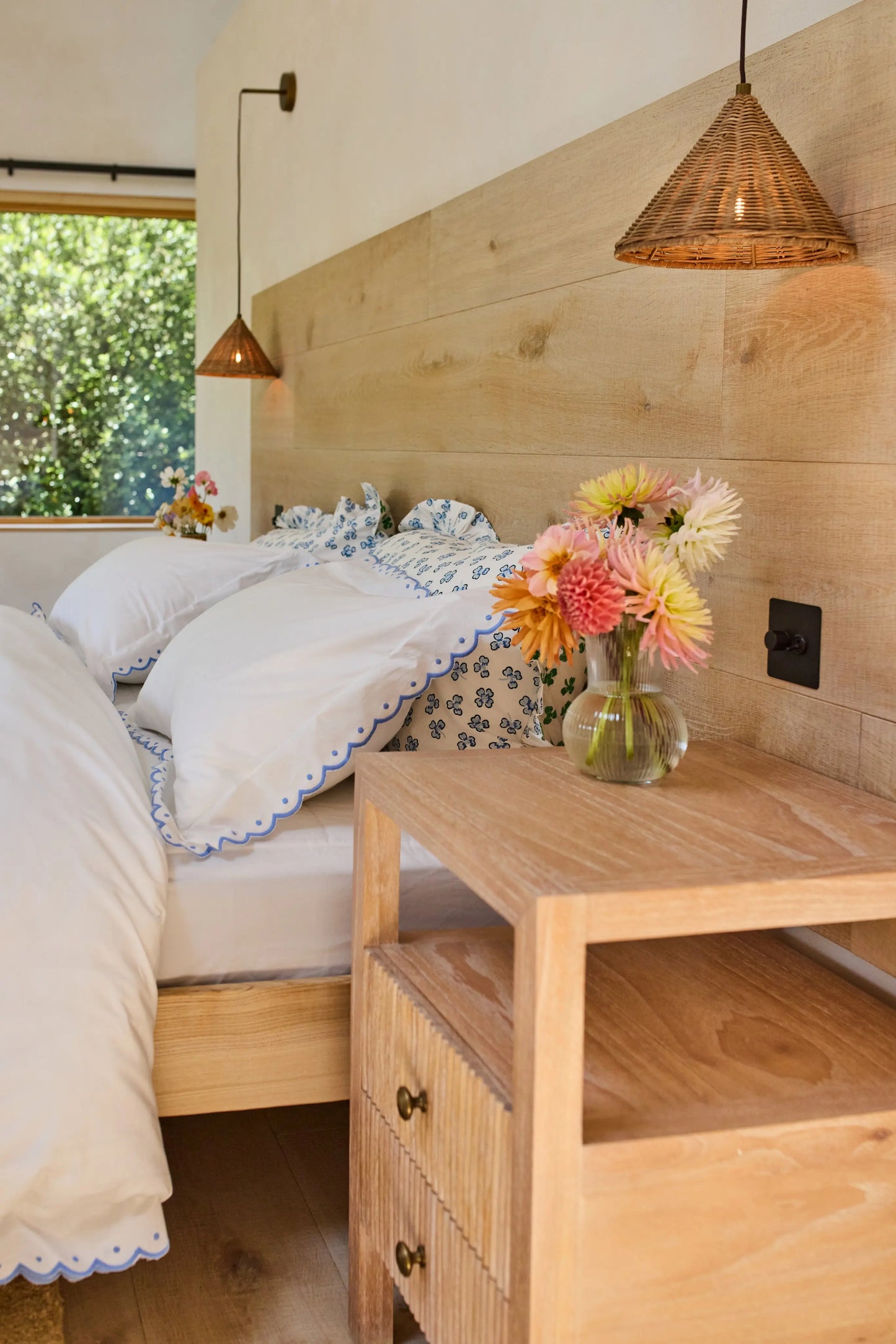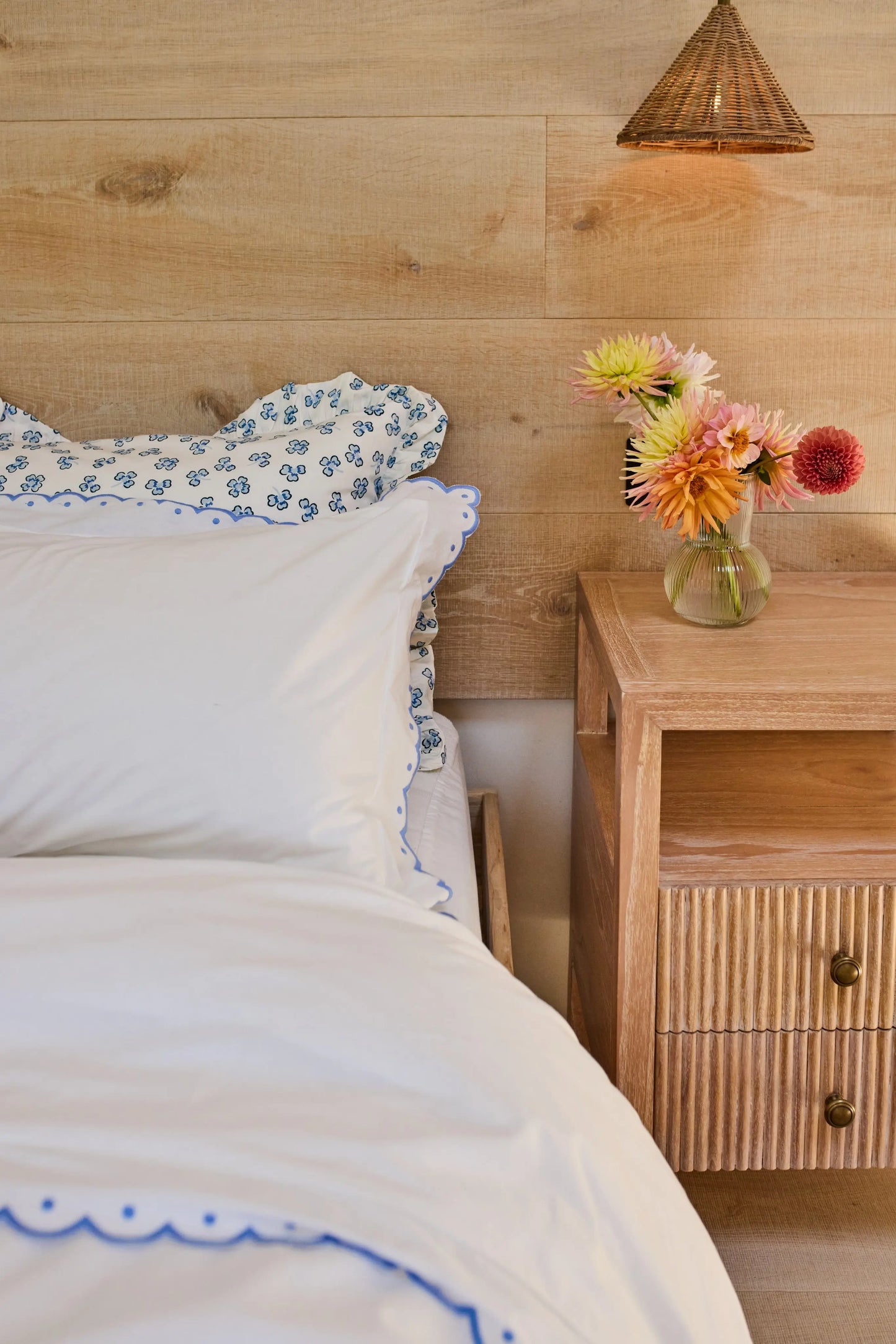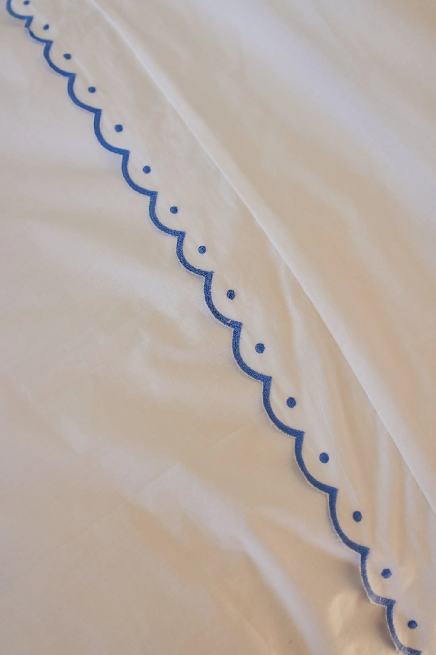 This white duvet cover and pillowcase set features a modern blue scalloped Oxford border. Included in the bundle there is a duvet cover & 2 x pillowcases. From single up to super king size available.