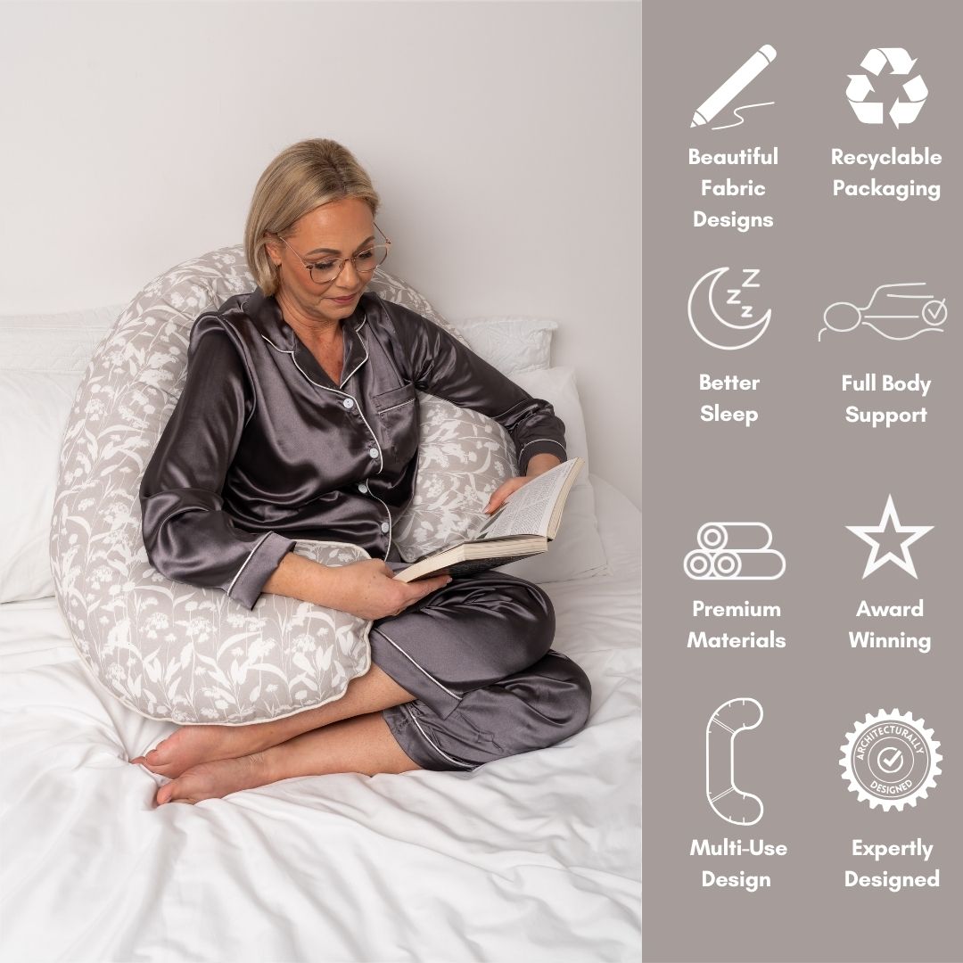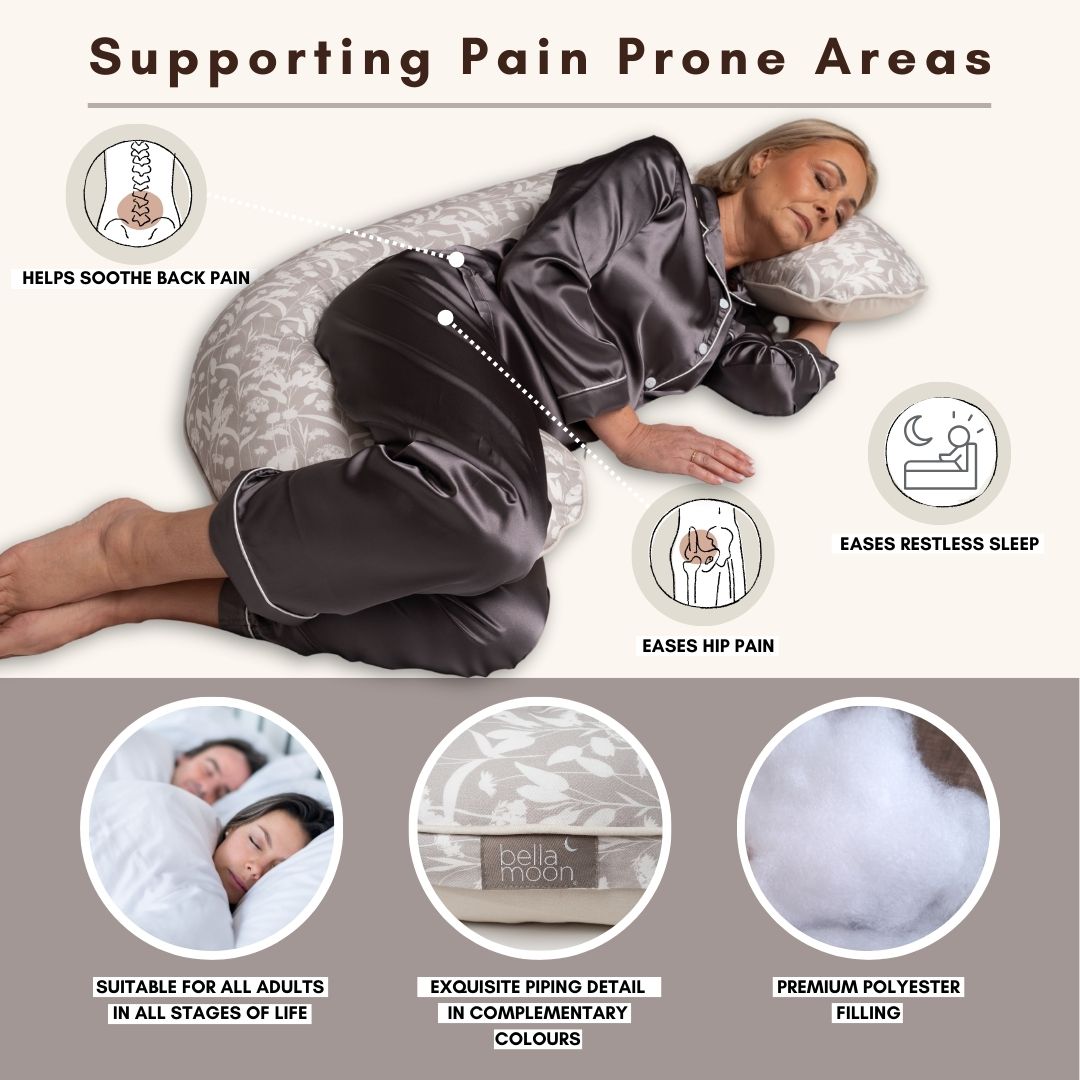The BellaMoon™ Body Pillow is designed to offer full-body comfort and support, whether you're relaxing, lounging, growing a baby, recovering from an injury or operation, experiencing hormonal changes and hot-flushes, or simply - winding down for the night. Its award-winning C-shaped design wraps around the body, helping you feel supported from head to toe.
