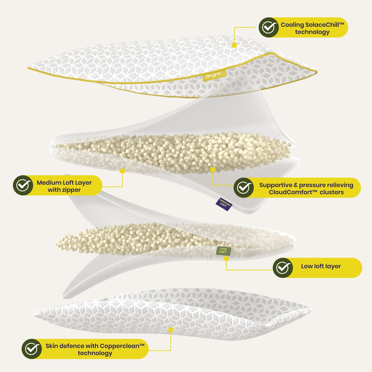 Regular price £79.90The Brightr® Sleep Luna adjustable memory foam pillow is designed for side sleepers to fight achy neck and shoulders caused by sleeping on pillows that are too soft or hard. This medium firm pillow is filled with cooling graphene memory foam that conforms to the unique shape of your head and neck. Offering support where it's needed most, this pillow is sure to provide a more comfortable night's sleep.